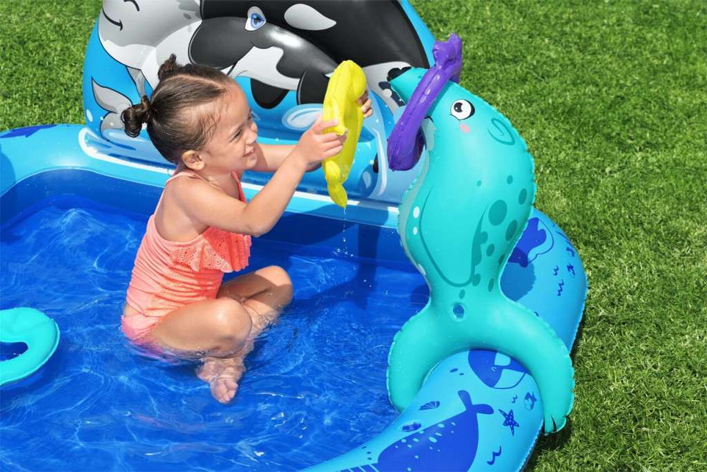 Der Spielbereich ist mit niedlichen Aufdrucken von Meerestieren verziert, die alle Kinder ansprechen werden. Bestway hat auch an die praktischen Aspekte der Nutzung gedacht, mit einem einfach zu bedienenden und langlebigen Ablassventil, das das Entleeren der Duschwanne nach dem Spielen schnell und einfach macht.