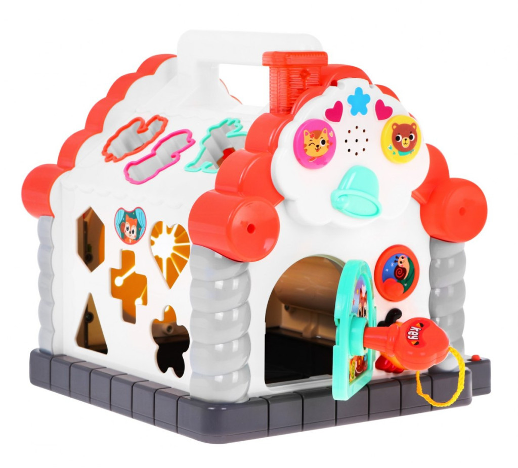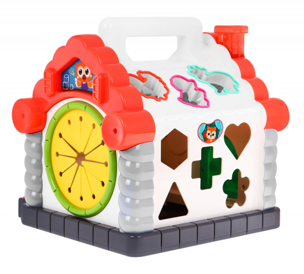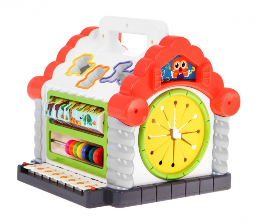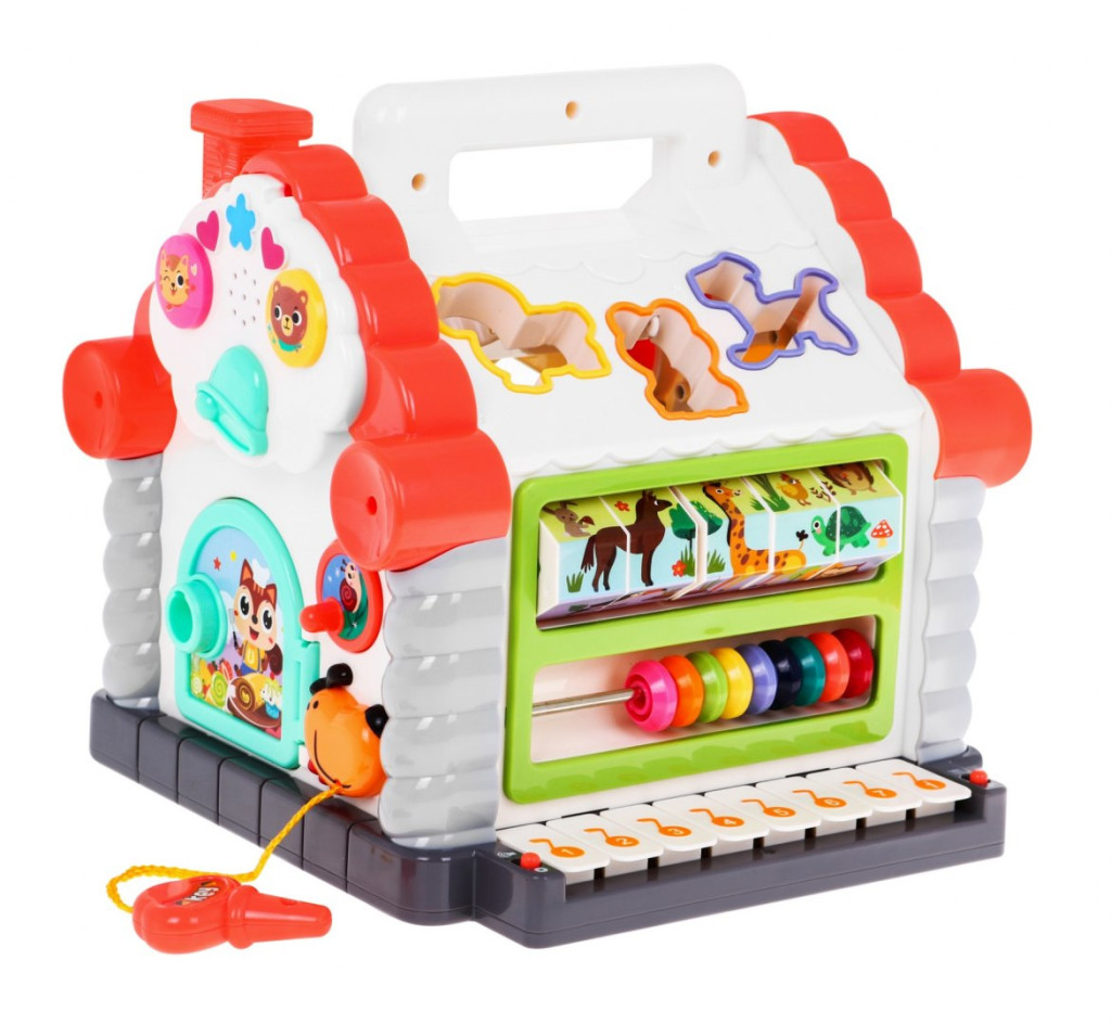 Interaktywny domek dla dzieci od 18-go miesiąca życia. DOM posiada cztery interaktywne płaszczyzny boczne, oraz aktywne dwa spady dachowe.