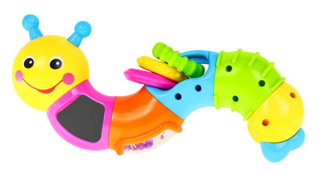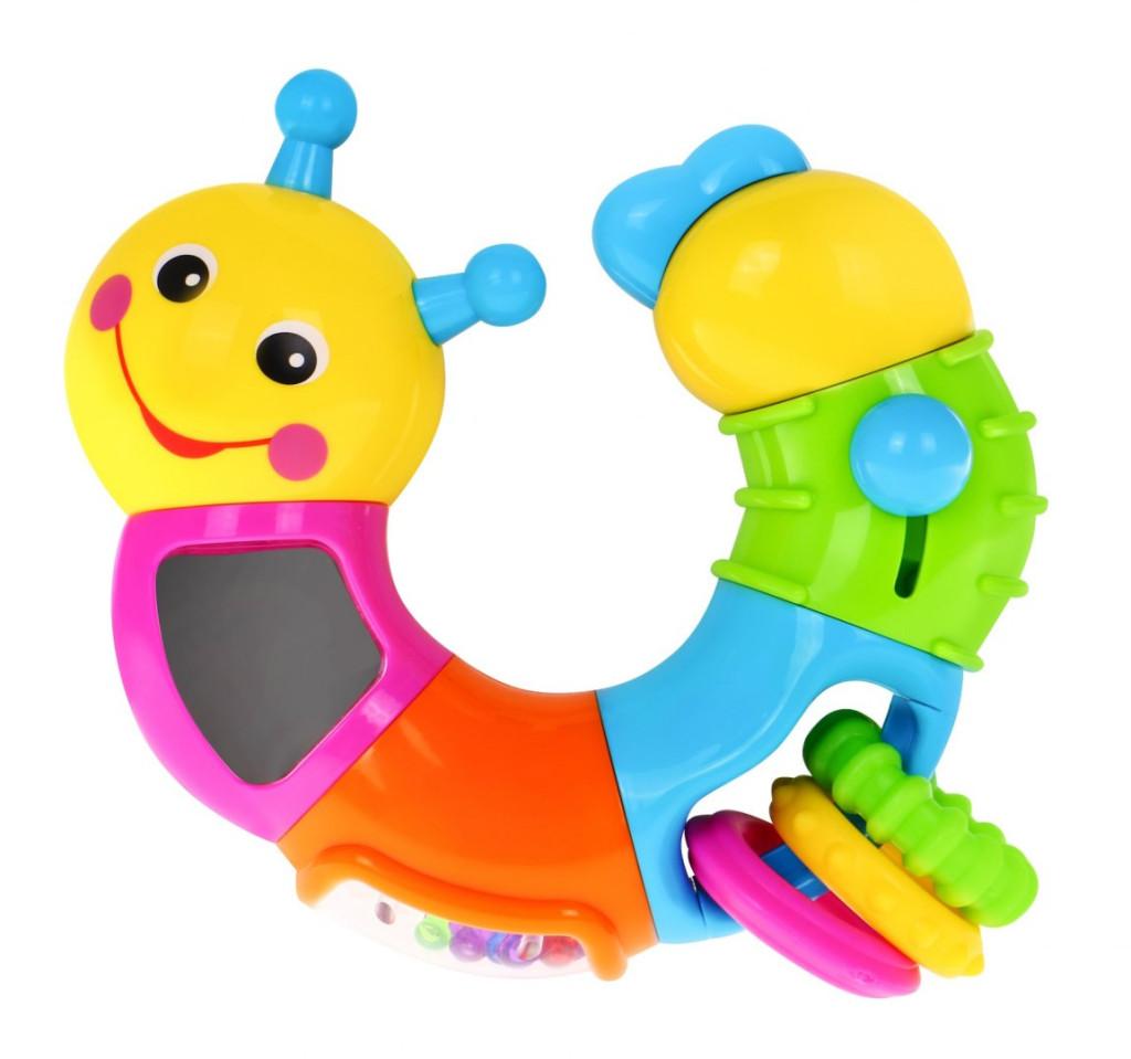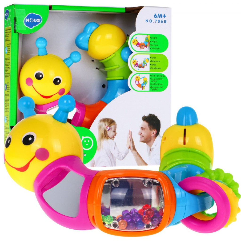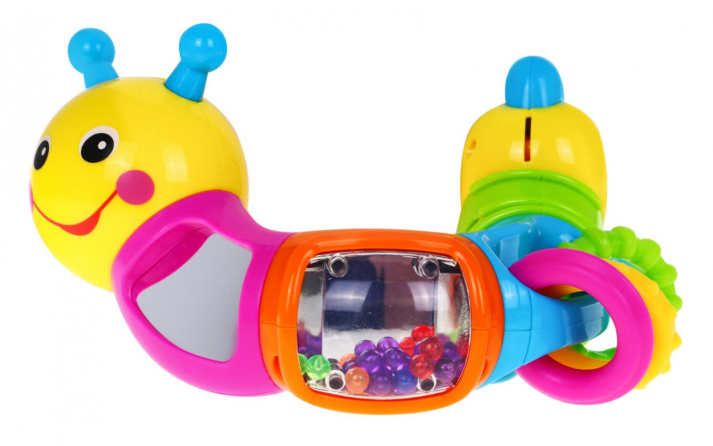 posiada kuleczki w pojemniku z bezpiecznego lusterka oraz obraca się wokoło własnej osi o 360 stopni wydając przy tym dźwięki - kuleczki grzechoczą podczas zabawy.
