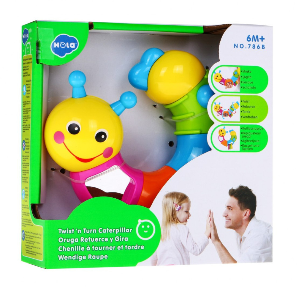 głowa gąsienicy z uśmiechniętą buzią obraca się wokoło własnej osi o 360 stopni wydając przy tym dźwięk chrobotania.
