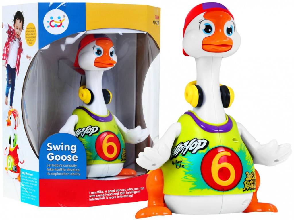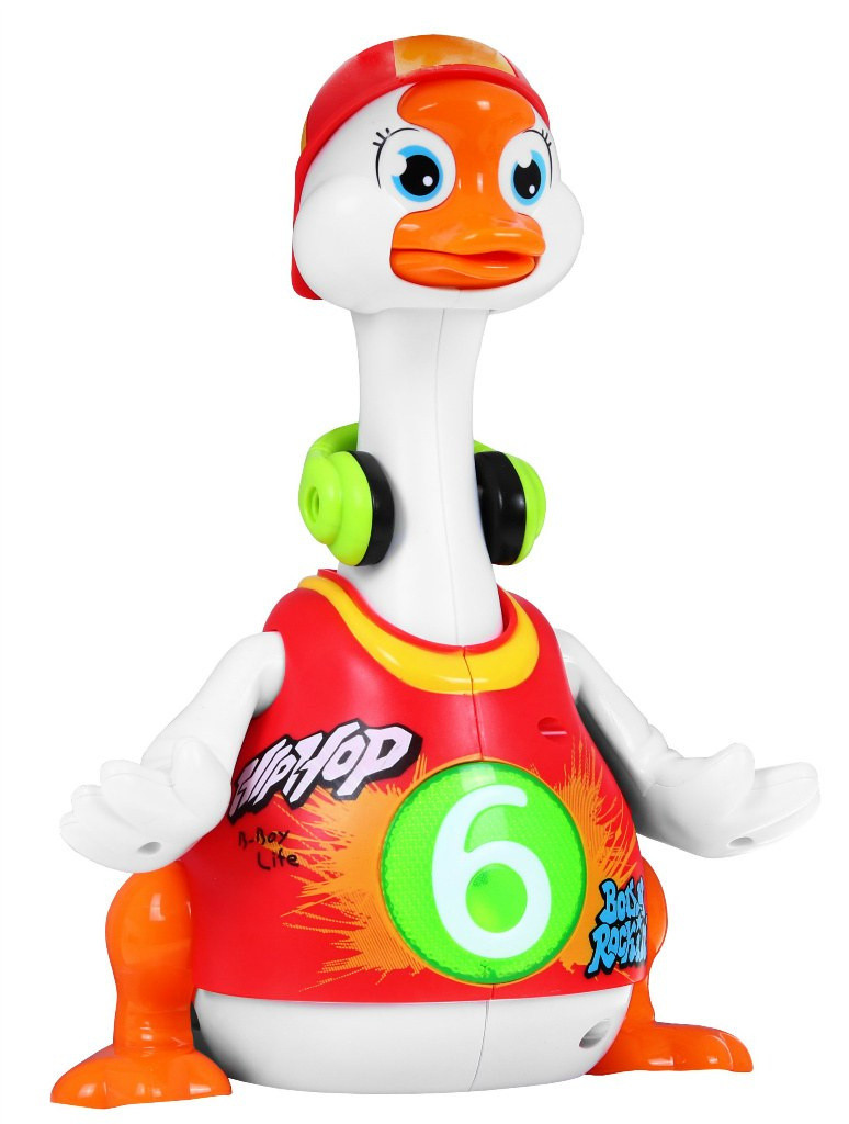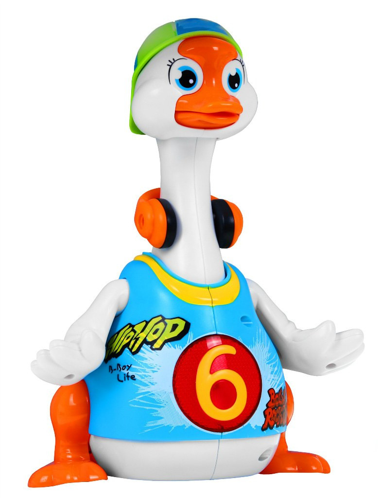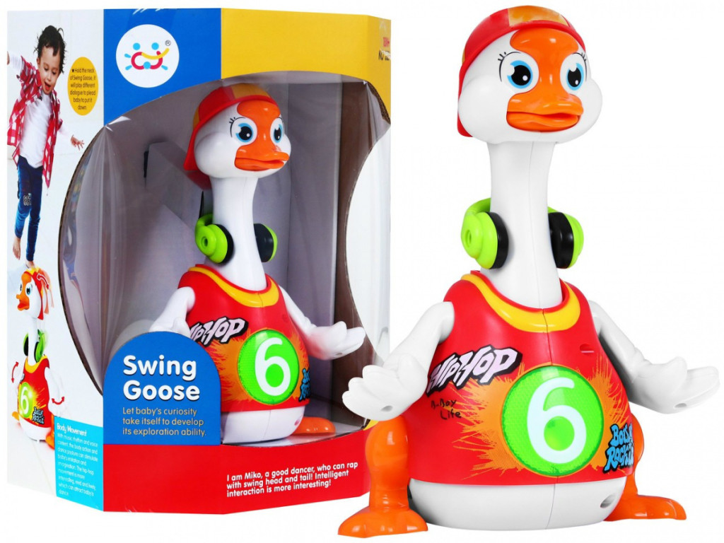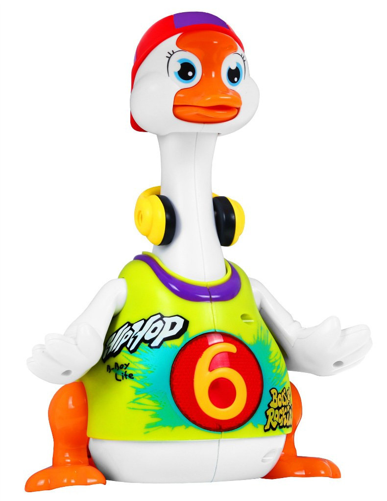 W rytm skocznych melodii kaczuszka tanecznie porusza się po płaskiej powierzchni, radośnie ruszając skrzydełkami, nóżkami oraz głową i szyją.