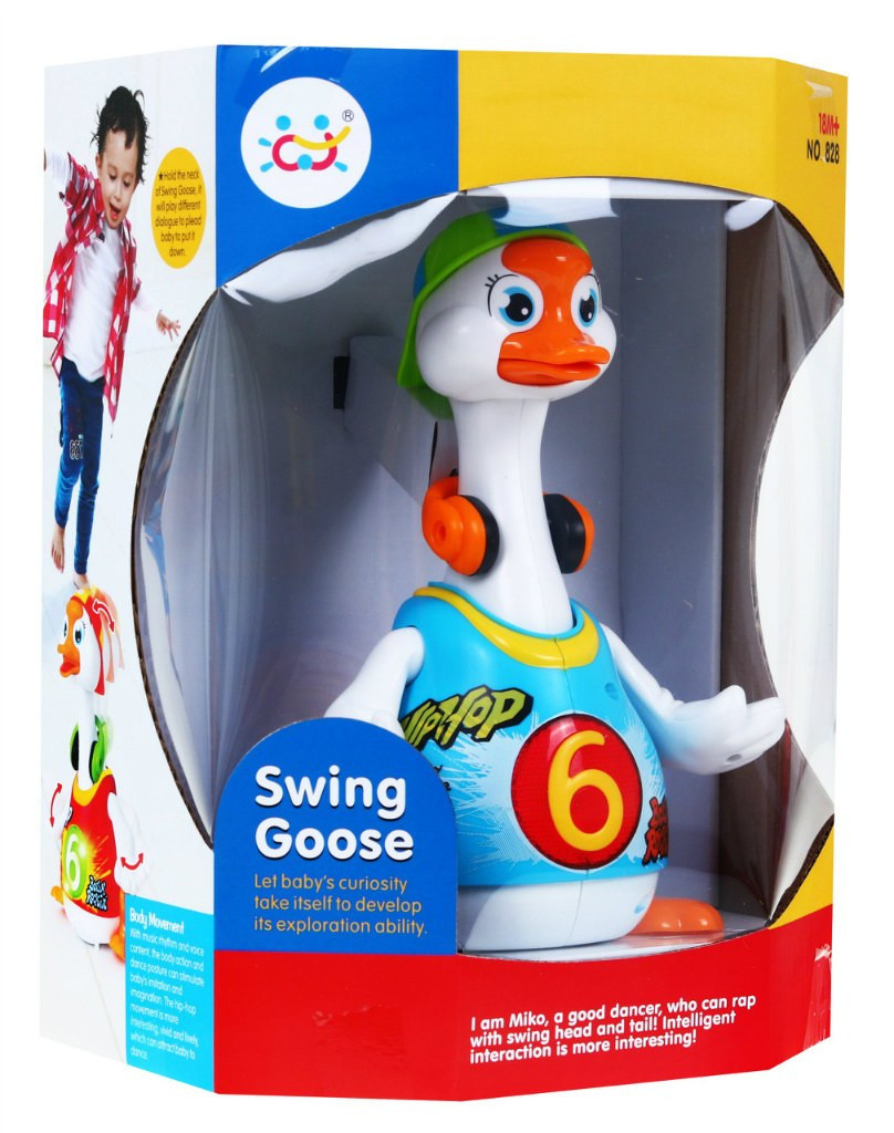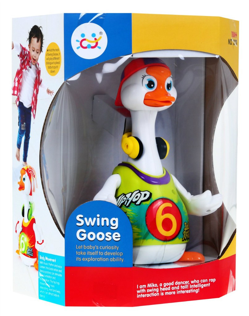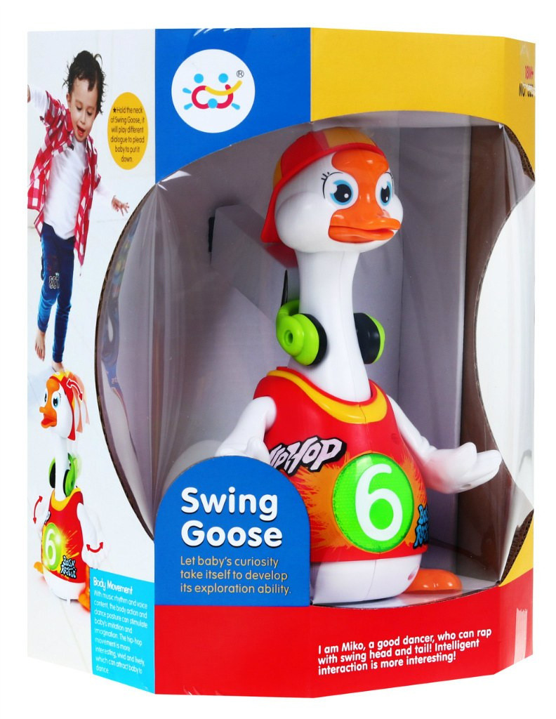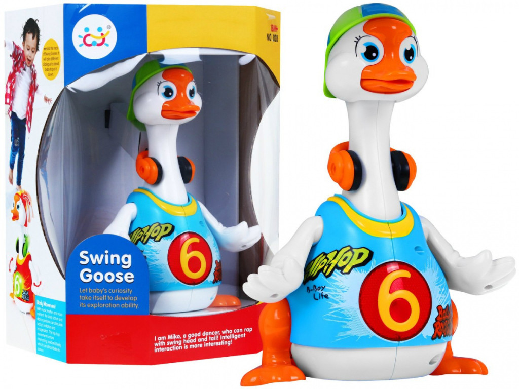 W rytm skocznych melodii kaczuszka tanecznie porusza się po płaskiej powierzchni, radośnie ruszając skrzydełkami, nóżkami oraz głową i szyją.