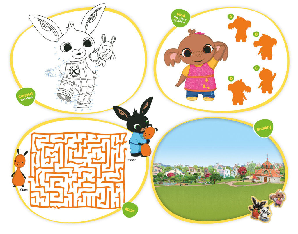 - 4 db játék: összekötni a számokat, megtalálni az árnyékot, labirintus és egy táj amire matricákat lehet ragasztani