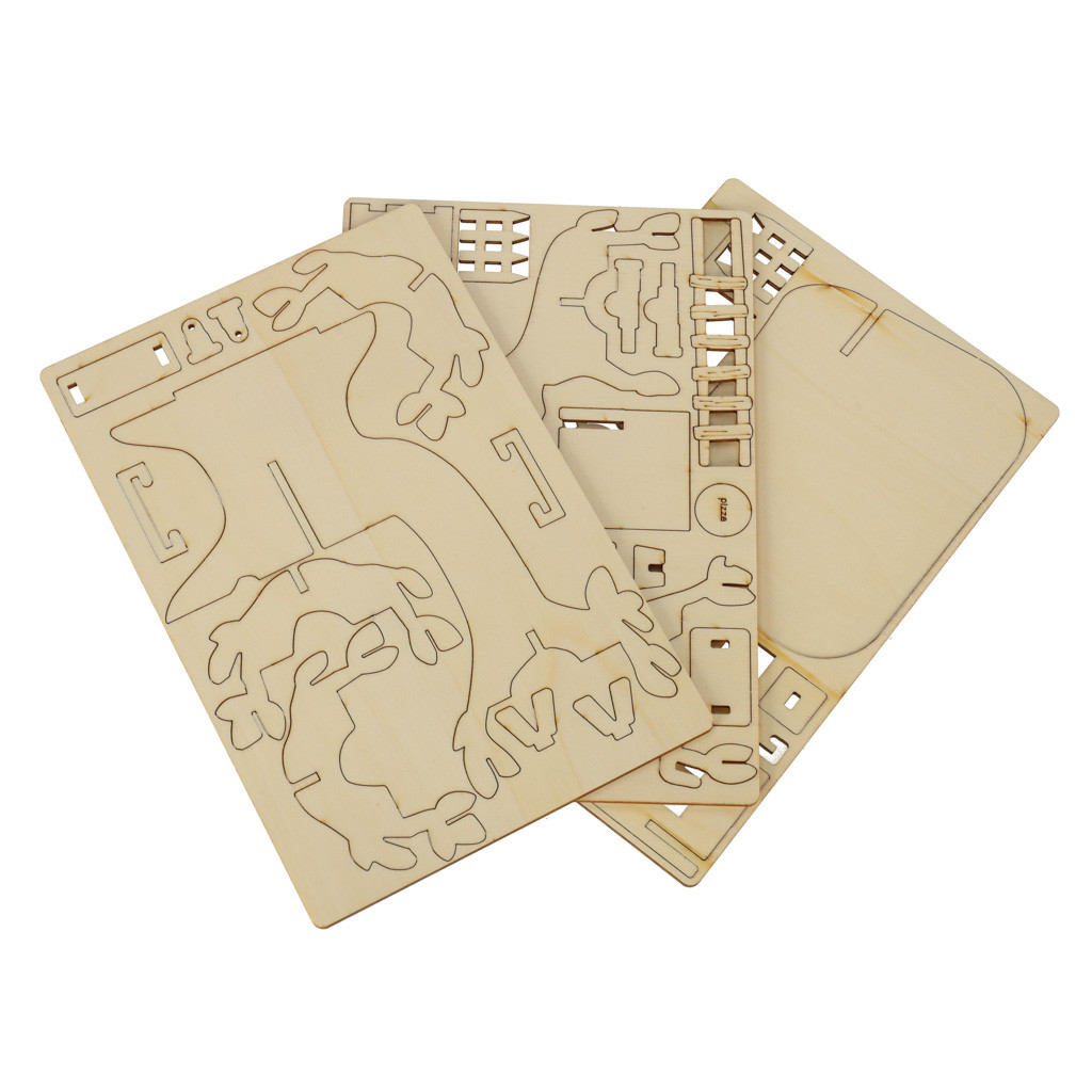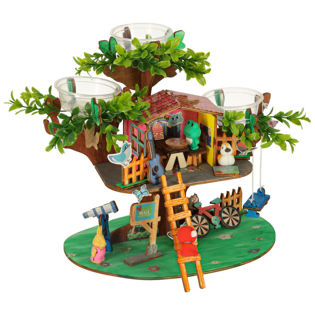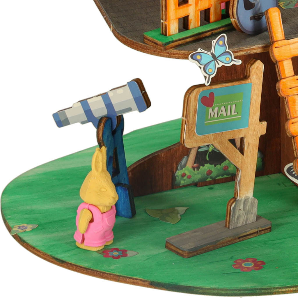 A készlet fadarabokat tartalmaz, amelyeket össze kell illeszteni, hogy stabil házat alkossanak. A mellékelt színes festékek lehetővé teszik a faépítmény teljes személyre szabását. A négy színes figura bájt kölcsönöz az egész díszletnek, és egyedi, kreatív történetek megalkotására inspirál, amelyekben a faház egyedi lakókat nyer.