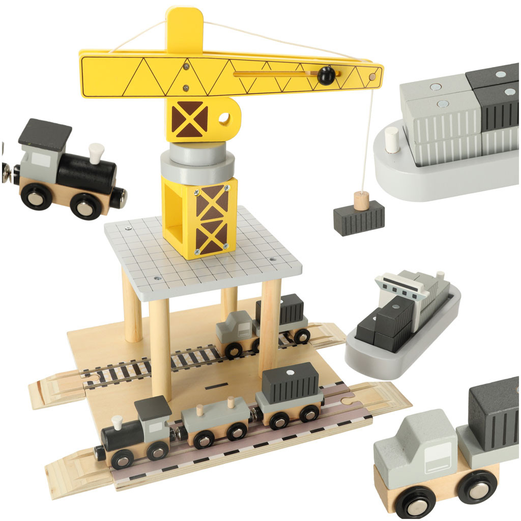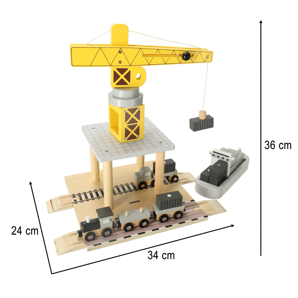 A fából készült tengeri kikötő daruval nagyszerű játék a kis közlekedés és az építkezés szerelmeseinek. A készlet egy sárga kikötői daruból áll, amely forgatható és konténereket emelhet le a hajóról a szállítójárművekhez - egy teherautóhoz és egy vonathoz két vagonból. A különböző alkatrészek lehetővé teszik, hogy a gyermek olyan jeleneteket játsszon el, mint egy igazi kikötőben, fejlesztve kreativitását, kézügyességét és motoros koordinációját.