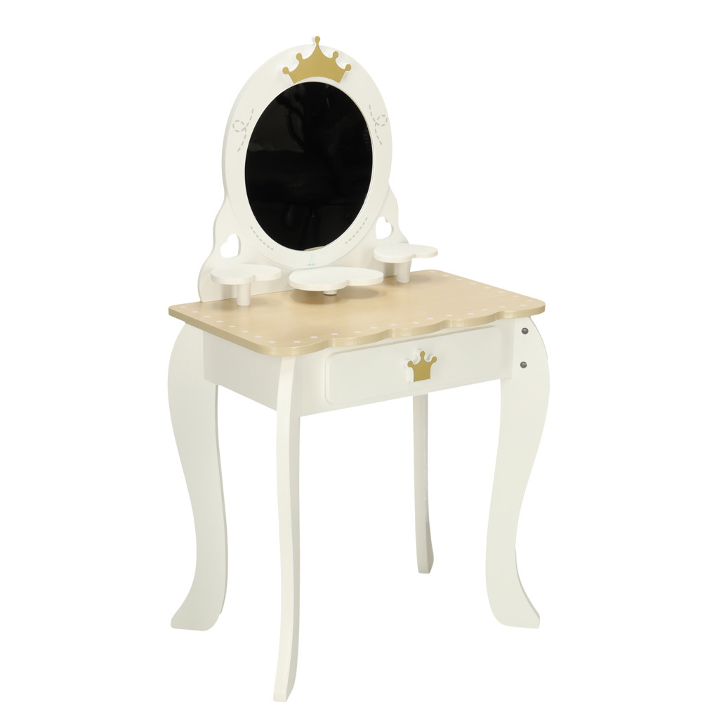 Az öltözőasztal és tartozékai teljes egészében fából készültek, amelyet simára csiszoltak és nem mérgező festékkel festettek. A fehér és arany színösszeállítás minimalistává teszi a készletet, amely tökéletes dekoráció egy gyerekszobába.