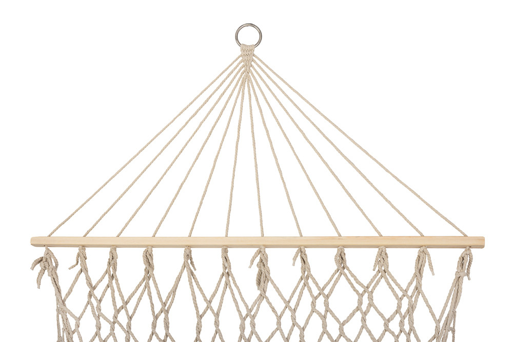 A függőágy sűrű szövésű pamutkötelekből (65%) készült, aminagy tartósságot biztosít. Akár 250 kilogramm súlyt is könnyedén elbír. A világos bézs szín és a szélein lévő bojtok elegáns megjelenést kölcsönöznek neki, amely tökéletesen illeszkedik bármilyen kerti környezetbe. A függőágyat egy 100 centiméter széles fakeretre függesztették fel, amely megfelelő stabilitást és kényelmet biztosít. Összetekerve nagyon kis helyet foglal, így könnyen tárolható.