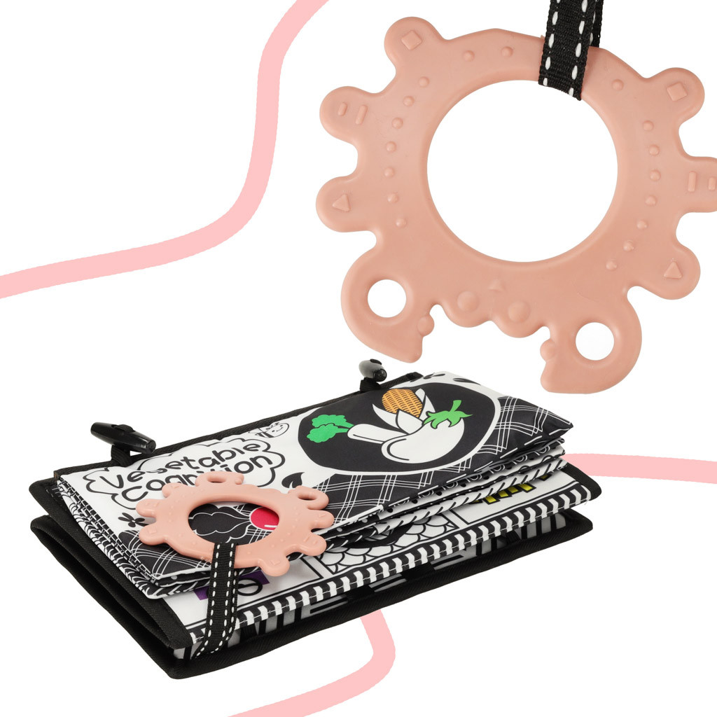 A kontrasztos színek és a zizegő címke aktívan stimulálja a baba érzékeit már a legelső napoktól kezdve!