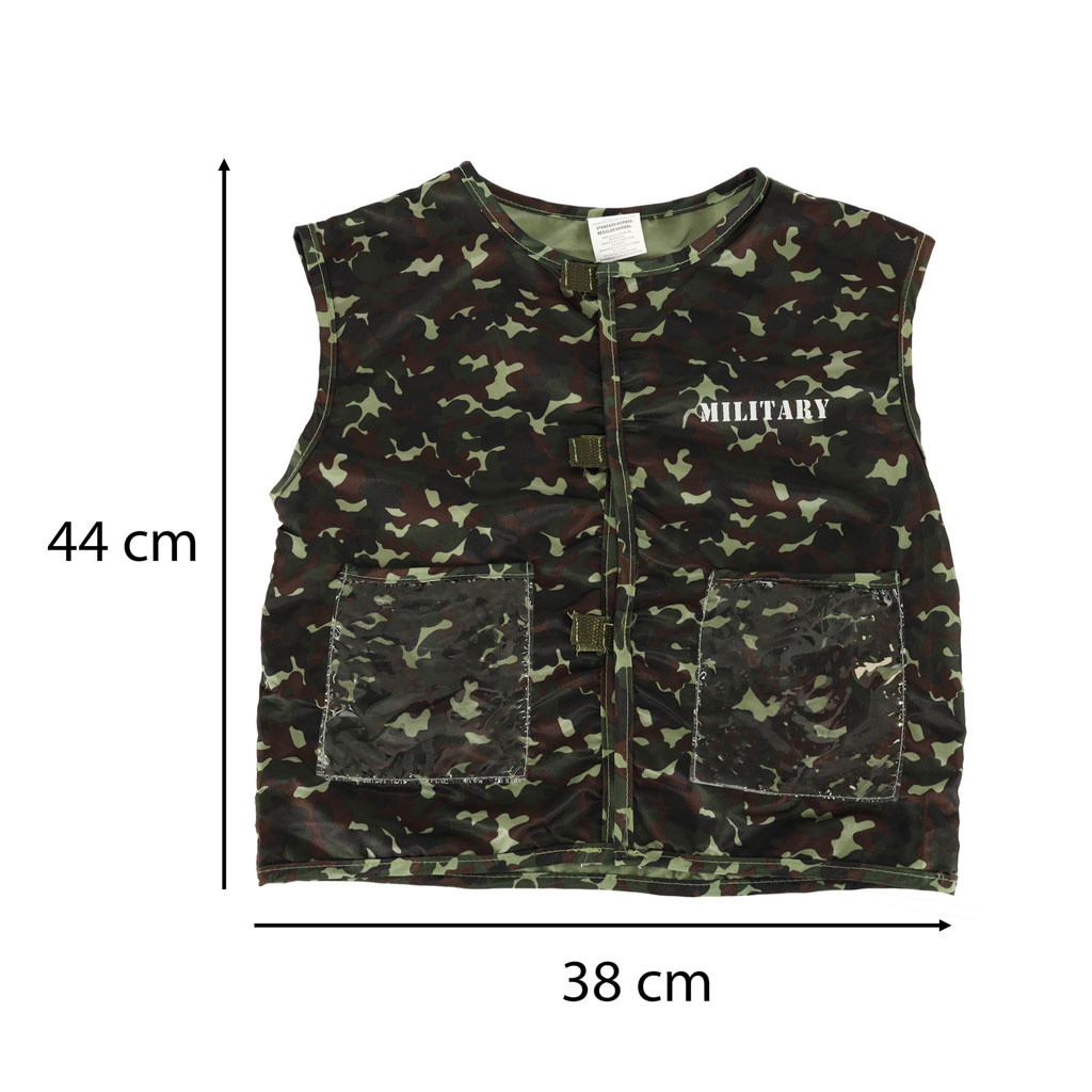 A szett tartalmaz egy moró mintás mellényt és egy katonai sisakot!