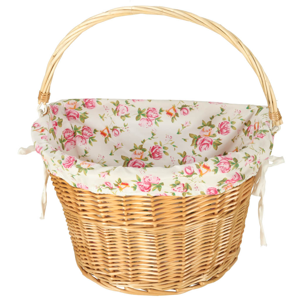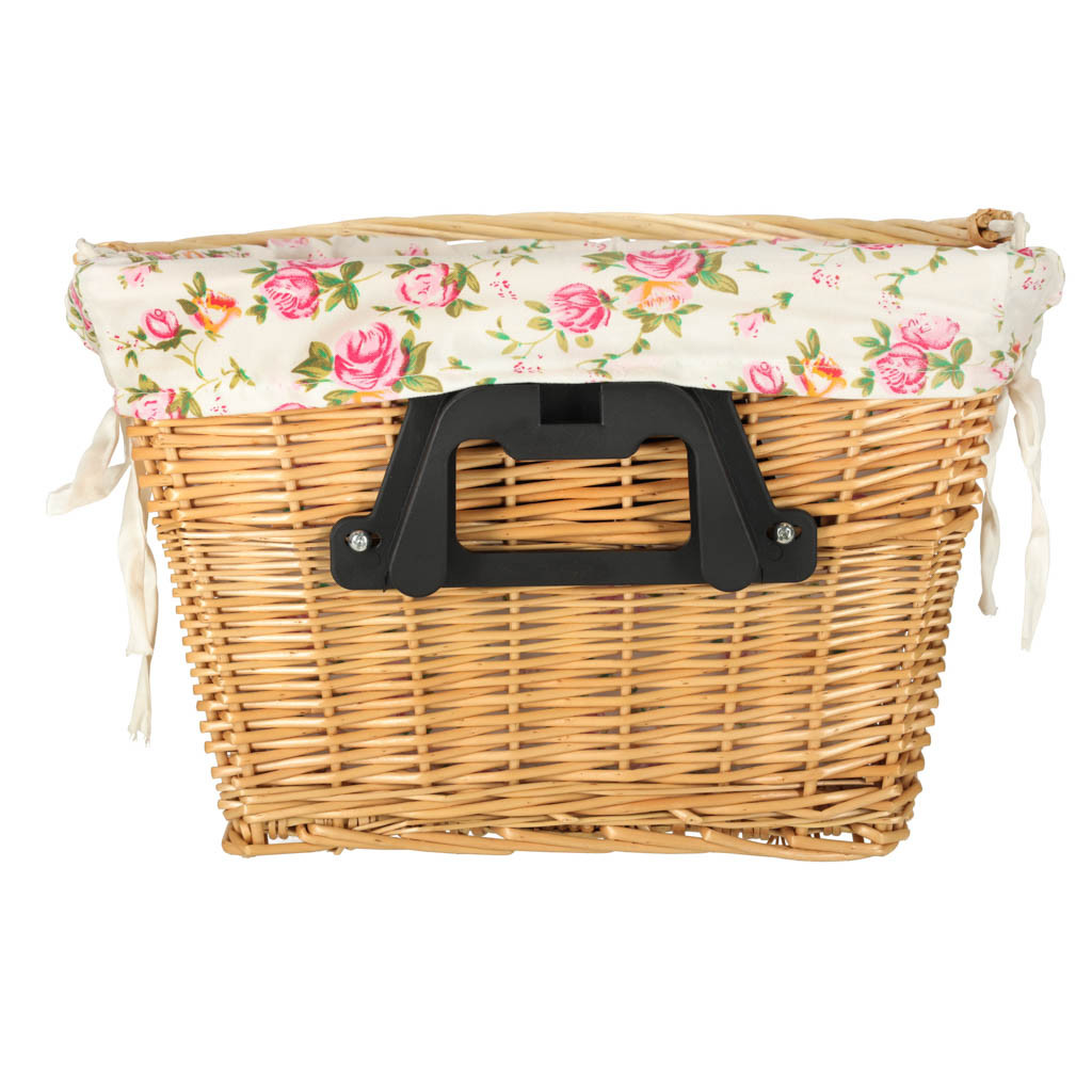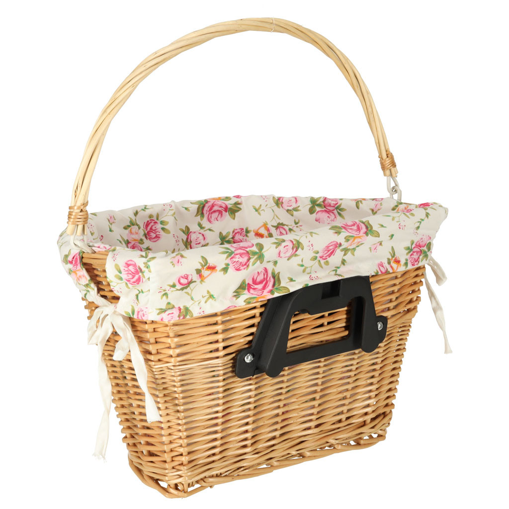 Fonott kerékpárkosár virágos szövetbetéttel. Fogantyúval rendelkezik a könnyű szállításhoz. A kattintós rögzítésnek köszönhetően a kosár könnyen le- és felcsatolható. Összeszerelési alkatrészeket tartalmaz. Anyaga: fonott kosár, poliészter. Méretek: 26 cm x 43 cm x 23 cm.