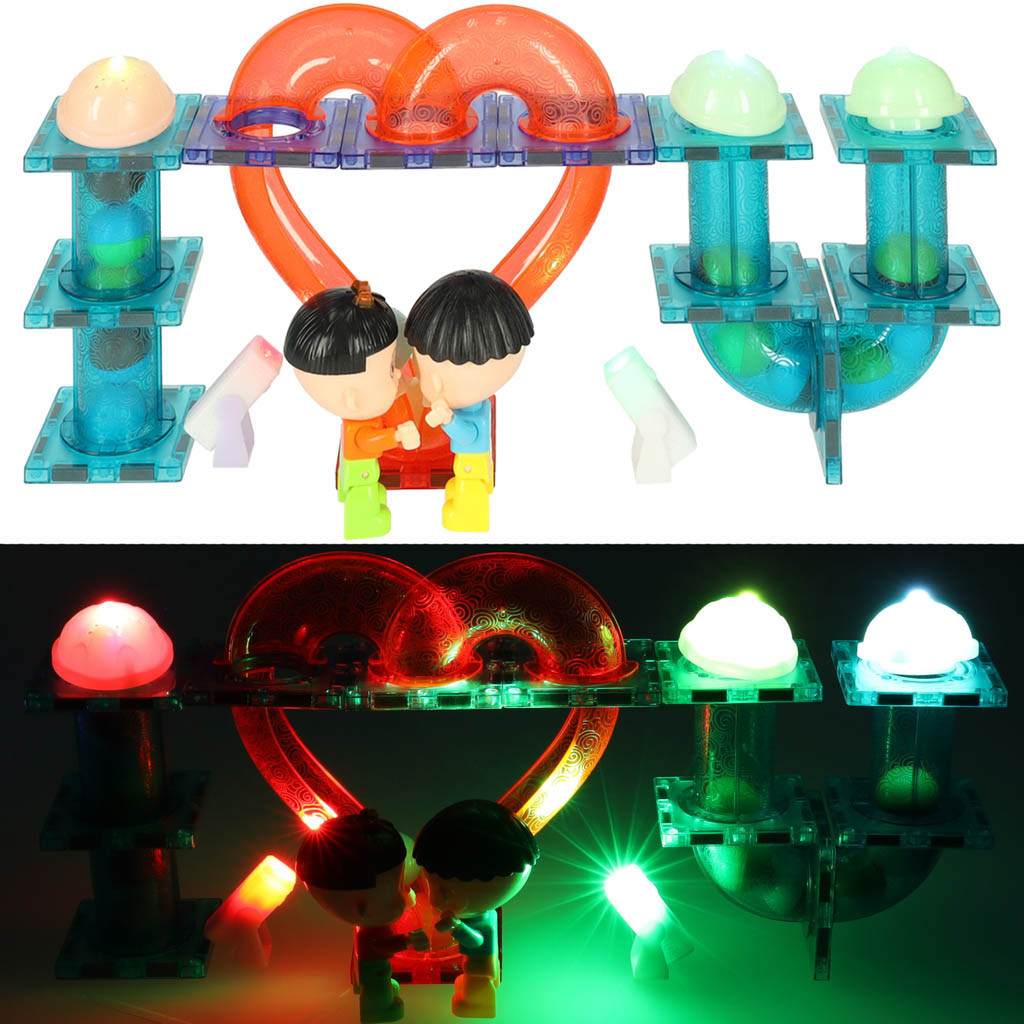 Ez a készlet azonban egyedülálló - számos lumineszkáló elemet tartalmaz, köztük golyókat, amelyek, ha mozgásba kerülnek, világítani kezdenek. Ennek eredményeképpen, ha a pálya megépül, a rajta mozgó golyók gyönyörű fényjátékot fognak alkotni!