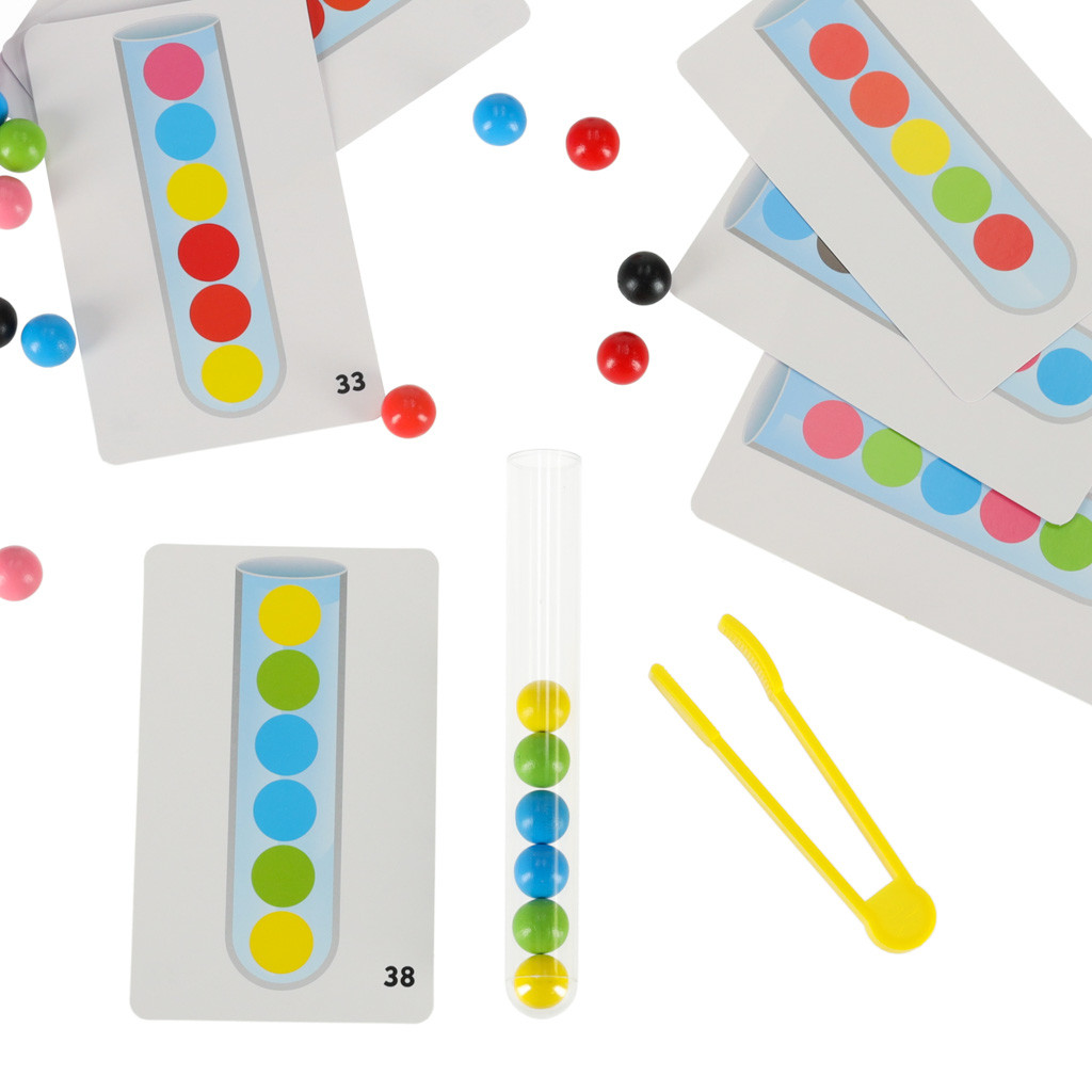 A játék fő célja, hogy a golyókat a megfelelő kémcsövekbe válogasd! A kisgyermek a kezével vagy a készlethez mellékelt fogóval is meg tudja csinálni!