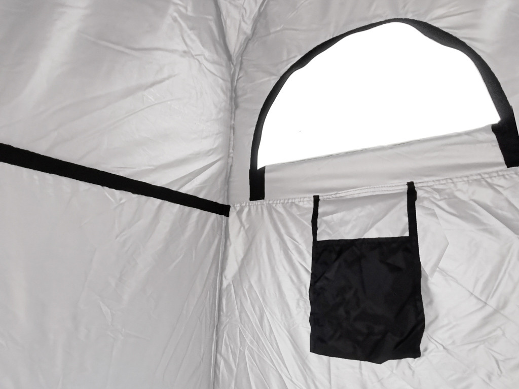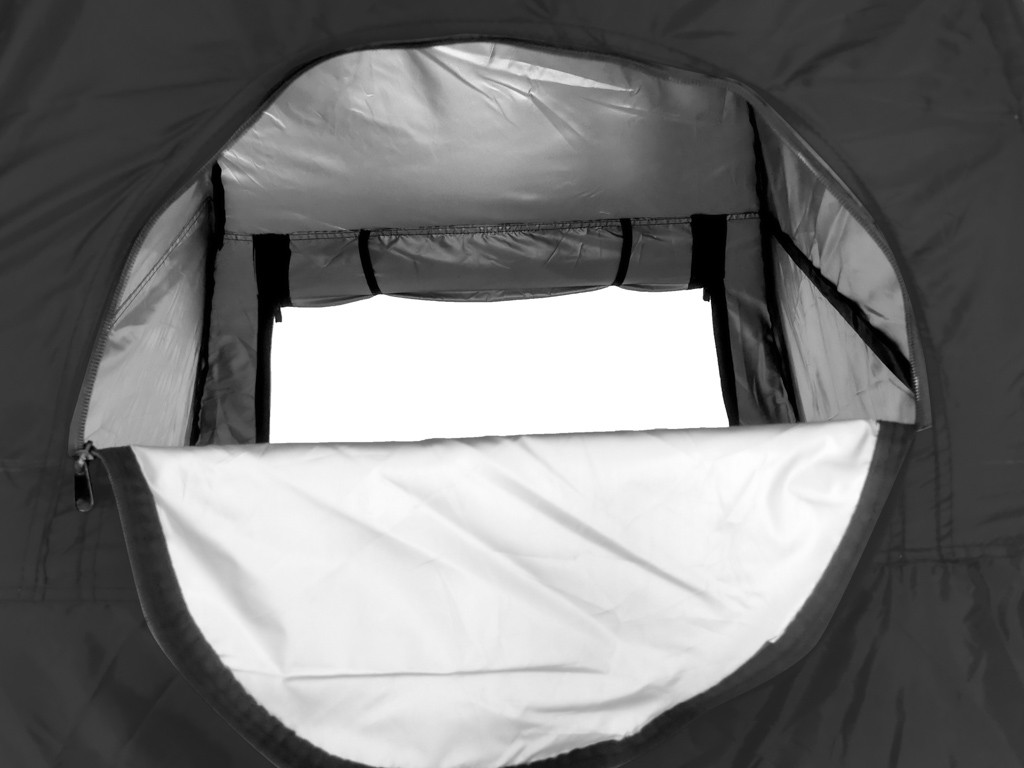 A bejárat elején van egy cipzáras bejárat. Hátul van egy kis nyílás, amely szintén cipzárral záródik, és amely tökéletes ablaknak. A sátornak nincs padlója.