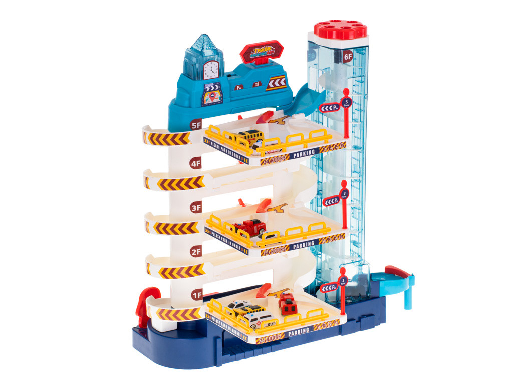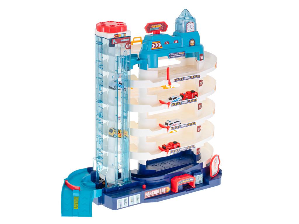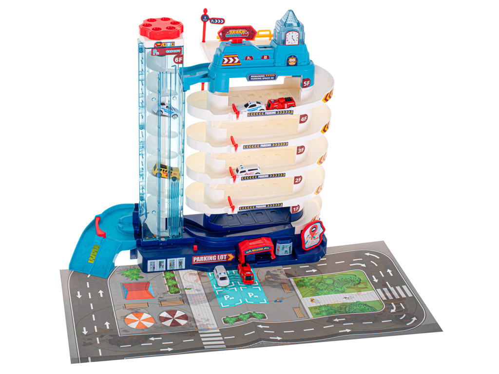 A parkoló 5 szintből áll, és a készletben található autók parkolására szolgál. Az autók egy automata felvonó segítségével juthatnak fel a tetejére.