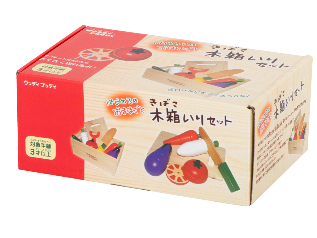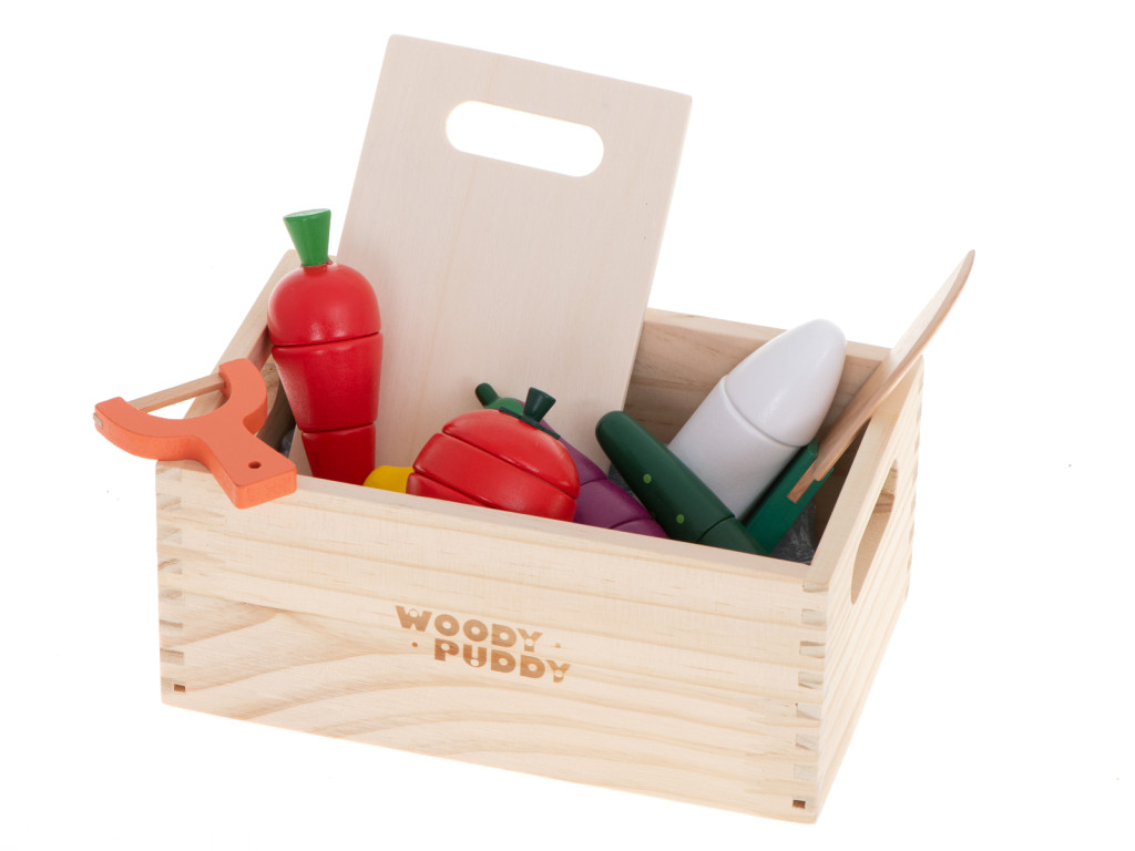 Színes zöldségek egy fadobozban, hogy finom vacsorát készítsen az összes babájának és plüssállatának.