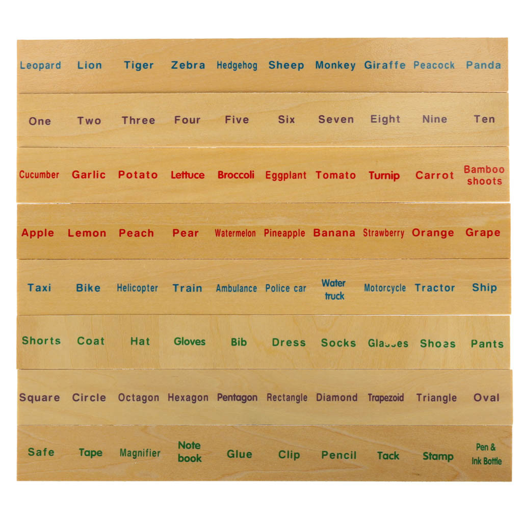 A táblákon számok, állatok, tárgyak stb. angol nevei szerepelnek..