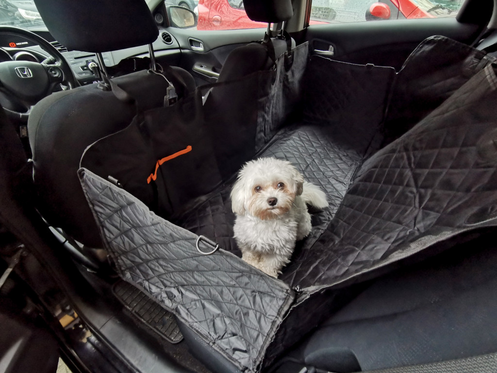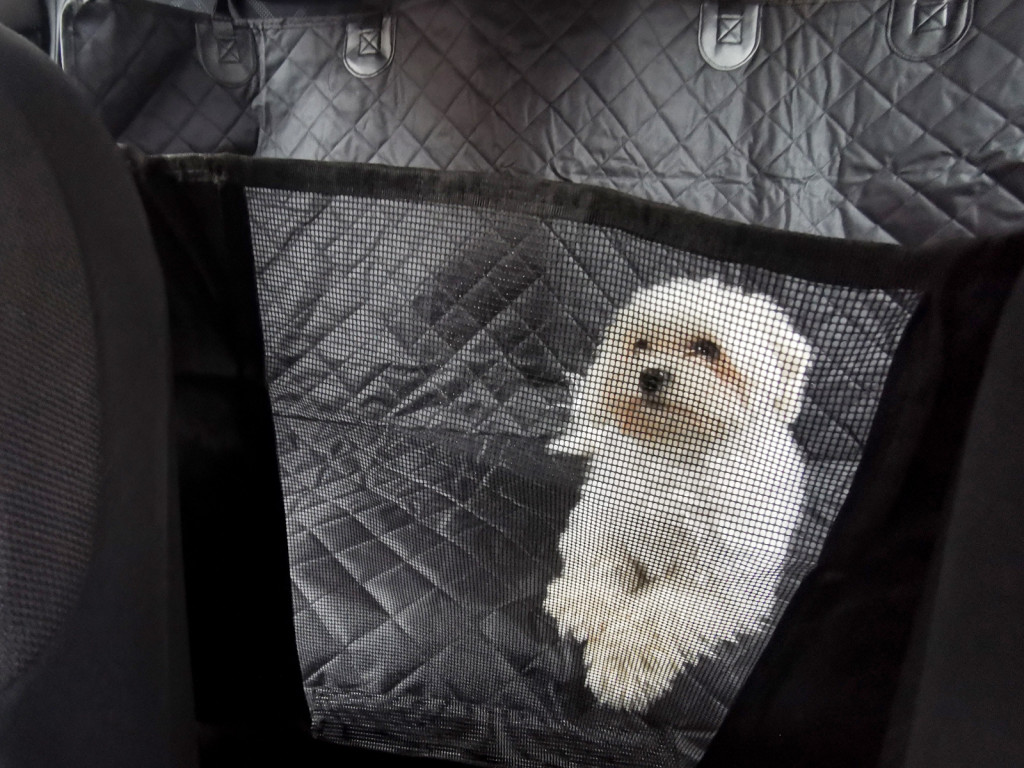 A szőnyeg elején - az első ülések között - egy hálót szereltek fel, hogy a háziállat láthassa a gazdáját és nézhessen az útra, de ne tudjon az első ülések felé mozogni.