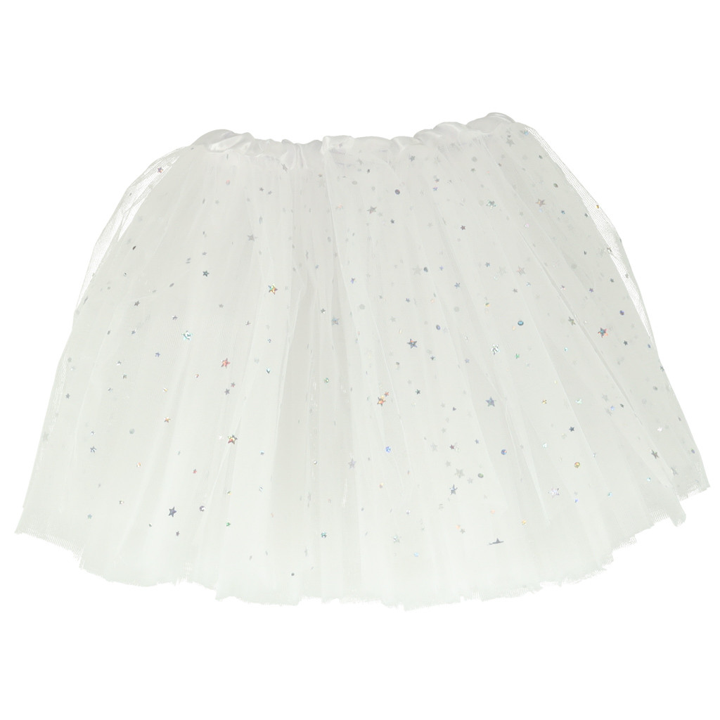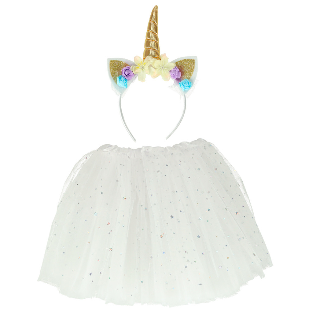 Farsangijelmez egyszarvú fejpánt és fehér hercegnő szoknya csillogó csillagokkal borítva.
