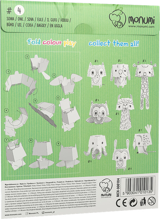 Przestrzenny, mały model zwierzaka z dużą głową do kolorowania. Wykonany z białego kartonu. Precyzyjnie wycięte elementy, łatwe do złożenia bez kleju czy nożyczek. Obrazkowa instrukcja na tyle opakowania.