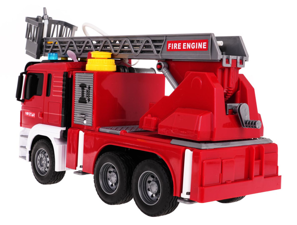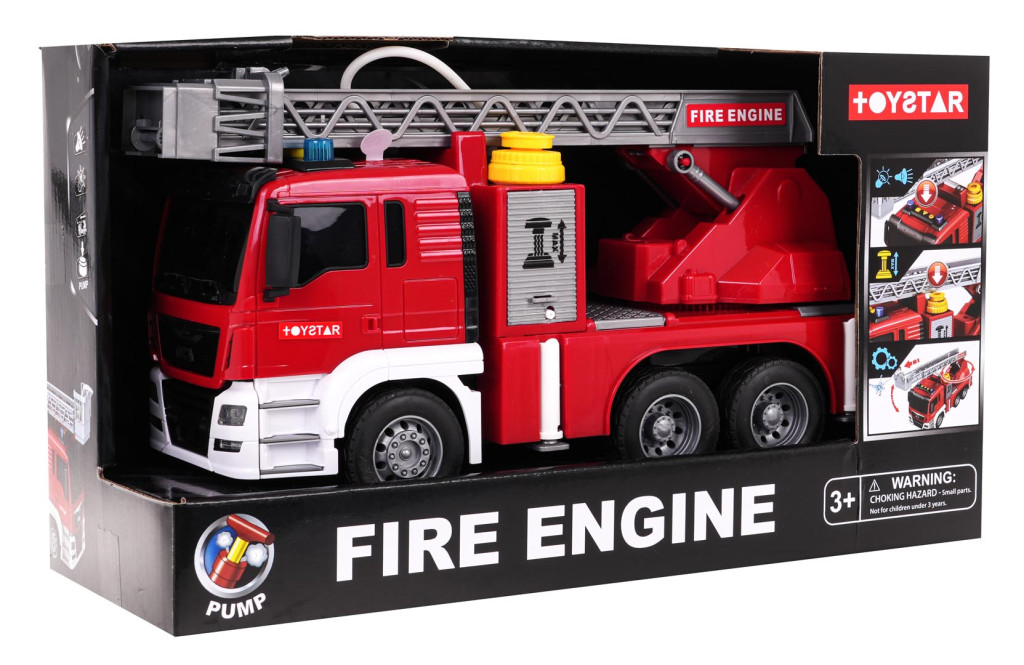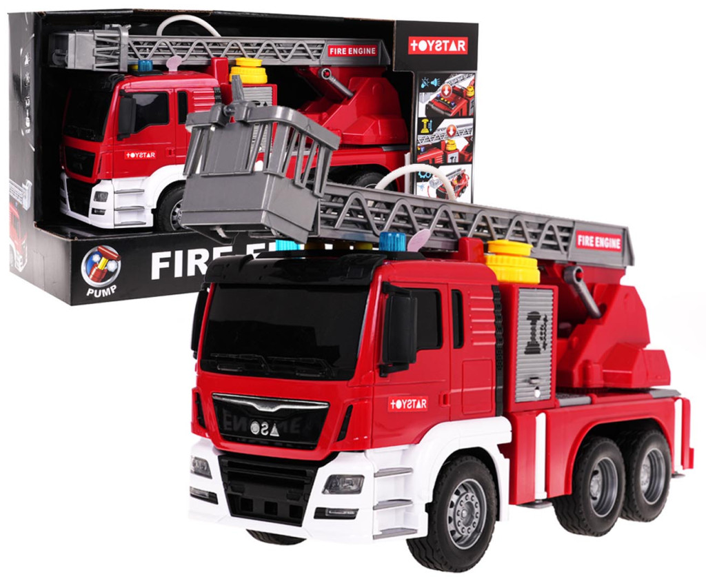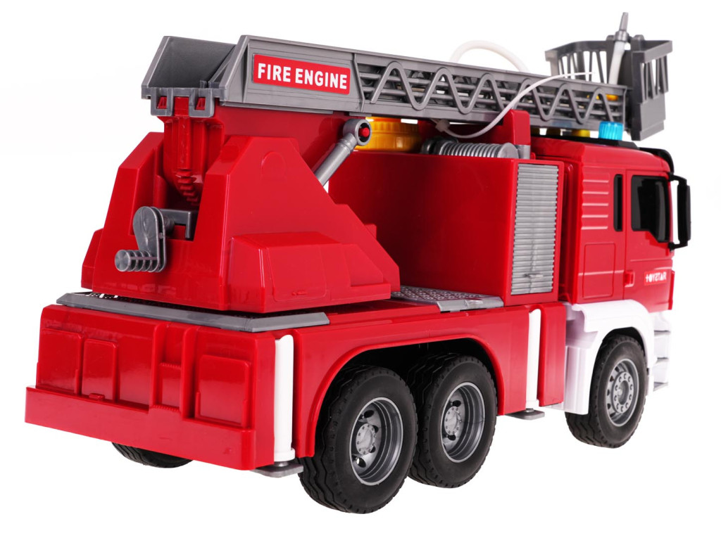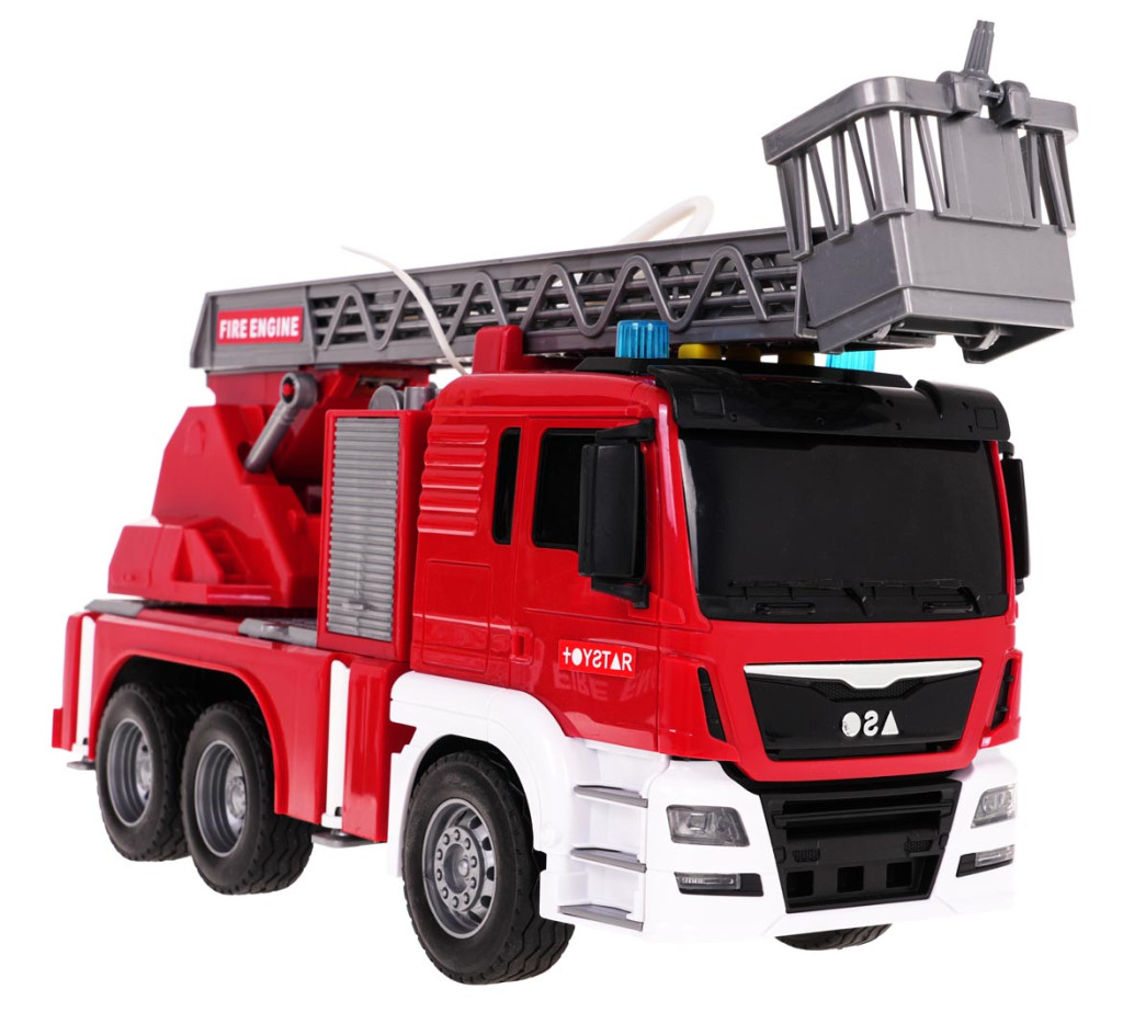Interaktywna straż pożarna z funkcją wody dla dzieci od 3-go roku życia. Straż wykonana została z najlepszej jakości plastiku w żywych kolorach. Posiada gumowe opony, dobrze trzymające się podłoża oraz napęd Friction. Na górze auta strażackiego znajdują się przyciski odpowiedzialne za generowanie dźwięków syren, odgłosów odpalania pojazdu oraz pracy silnika. Po bokach przycisków dźwiękowych są też świecące światełka. Drabinę wozu strażackiego możemy podnosić i opuszczać oraz wysuwać do przodu (manualnie). Po napełnieniu zbiorniczka znajdującego się przy kabinie pojazdu wodą i naciśnięciu pompki z węża będzie wydobywać się woda. Zabawka zasilana jest bateriami typu 3 x AG13 (w zestawie). Funkcje wozu strażackiego: - przeznaczony dla dzieci od 3-go roku życia, - wykonany z najlepszej jakości plastiku w żywych kolorach, - gumowe opony, - napęd typu Friction, - efekty świetlne: światełka na górze kabiny, - efekty dźwiękowe: syreny, odgłosów odpalania pojazdu oraz pracy silnika, - podnoszona, opuszczana i wysuwana drabina z koszem, - obrotowy wysięgnik o 360 stopni (manualnie). - funkcja wody, - podnoszona boczna klapa wozu z wejściem na węża strażackiego, - 4 wysuwane podpórki, - otwierana klapa przy wysięgniku, - baterie znajdują się w zestawie. |