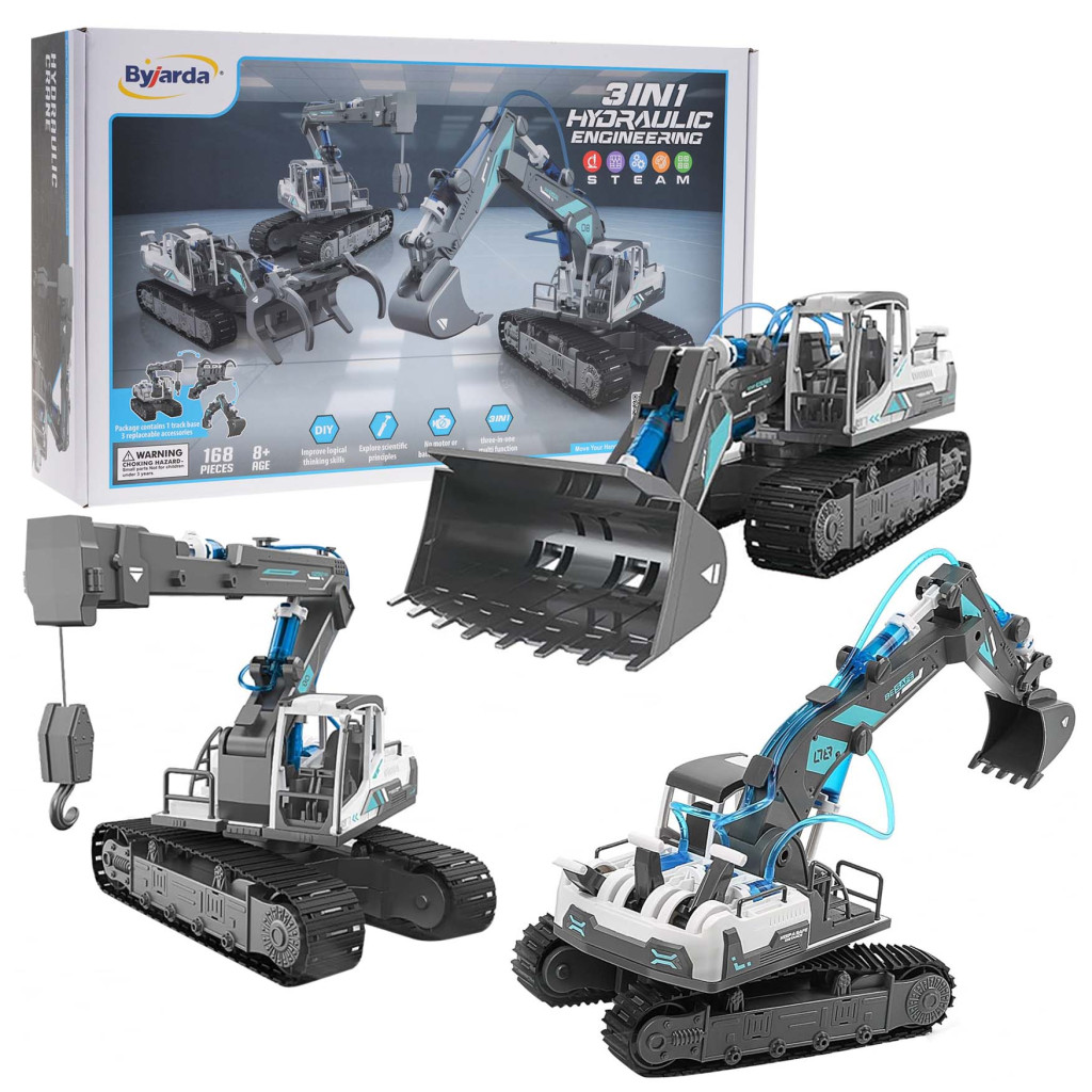 Zestaw naukowy 3 w 1 pojazdy do składania dla dzieci od 8-go roku życia. Cały zestaw składa się z 168 elementów, z których można ułożyć 3 kombinacje pojazdów. Pojazdy nie wymagają użycia baterii, posiadają zasilanie hydrauliczne na wodę. Zasilanie hydrauliczne odpowiada za czynności takie jak chwytanie, unoszenie i opuszczanie. Zestaw zawiera szczegółową instrukcję montażu każdego modelu. Pojazdy możliwe do złożenia: - koparka, - ładowarka do drewna, - dźwig. Funkcje: Koparka - ruch drążka w zakresie 52 stopni, - ruch łyżki w zakresie 60 stopni, - ruch wysięgnika w zakresie 31 stopni, - obrotowa platforma w zakresie 360 stopni, - gumowe obrotowe płozy Ładowarka do drewna - ruch drążka w zakresie 37 stopni, - ruch łyżki w zakresie 30 stopni, - ruch wysięgnika w zakresie 44 stopnie, - obrót platformy w zakresie 360 stopni, - gumowe obrotowe płozy Dźwig - ruchomy podnośnik góra – dół, - ruch wysięgnika w zakresie 33 stopnie, - ruch drążka w zakresie 38 stopni, - obrót platformy w zakresie 360 stopni, - gumowe obrotowe płozy |