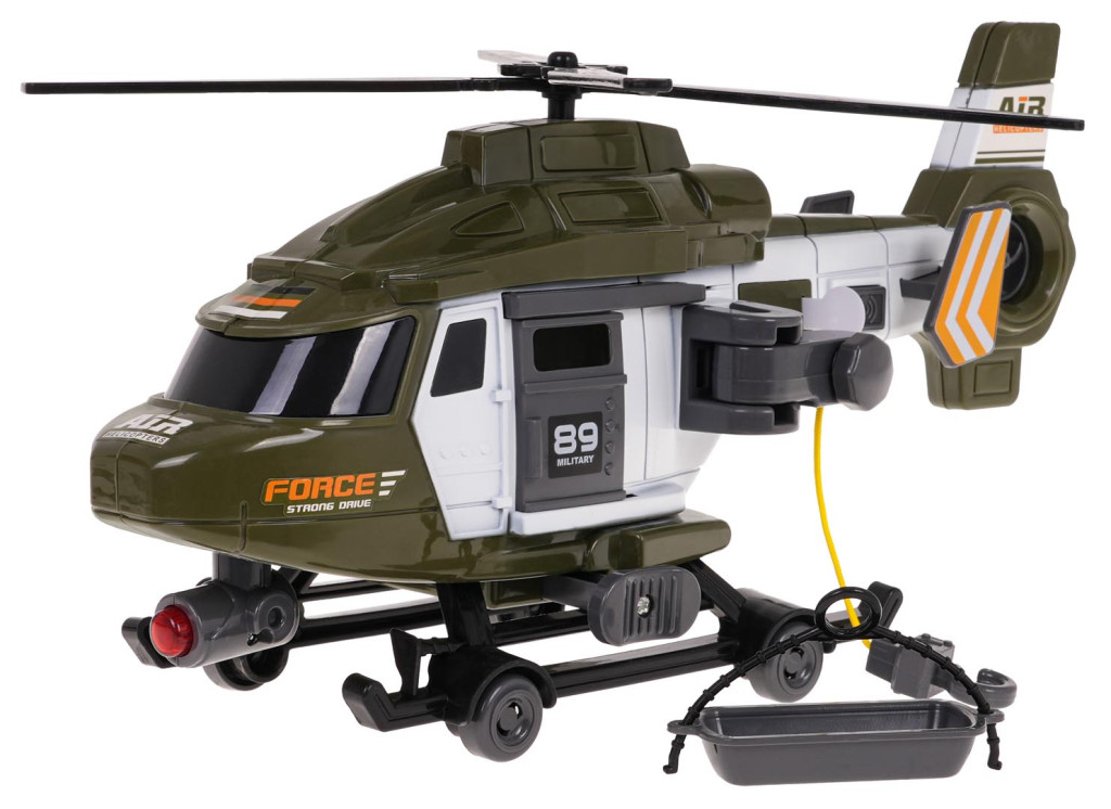 | Interaktywny, wojskowy helikopter ratunkowy, wykonany w skali 1:16, dla dzieci od 3-go roku życia. Wykonany został z najlepszej jakości plastiku w żywych kolorach. Helikopter posiada ruchome elementy takie jak otwierane drzwi, ruchomy hak z koszem, kółka i śmigła. Drzwi otwieramy, przesuwając je w lewo lub prawo, natomiast aby podnieść lub opuścić kosz należy kręcić kółkiem. Zabawka posiada efekty świetlne w postaci oświetlenia LED na dole helikoptera oraz efekty dźwiękowe w postaci autentycznych dźwięków wydawanych przez prawdziwy helikopter ratunkowy. Zabawka zasilana jest bateriami typu 3 x AG13 1,5 V(w zestawie). Funkcje zabawki: - przeznaczona dla dzieci od 3-go roku życia, - wykonana z najlepszej jakości plastiku w żywych kolorach, - skala wykonania 1:16, - otwierane drzwi boczne (manualnie), - ruchomy hak z koszem ratunkowym (manualnie), - ruchome śmigła (manualnie), - ruchome kółeczka, - oświetlenie, - realistyczne dźwięki. |