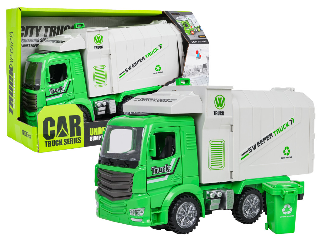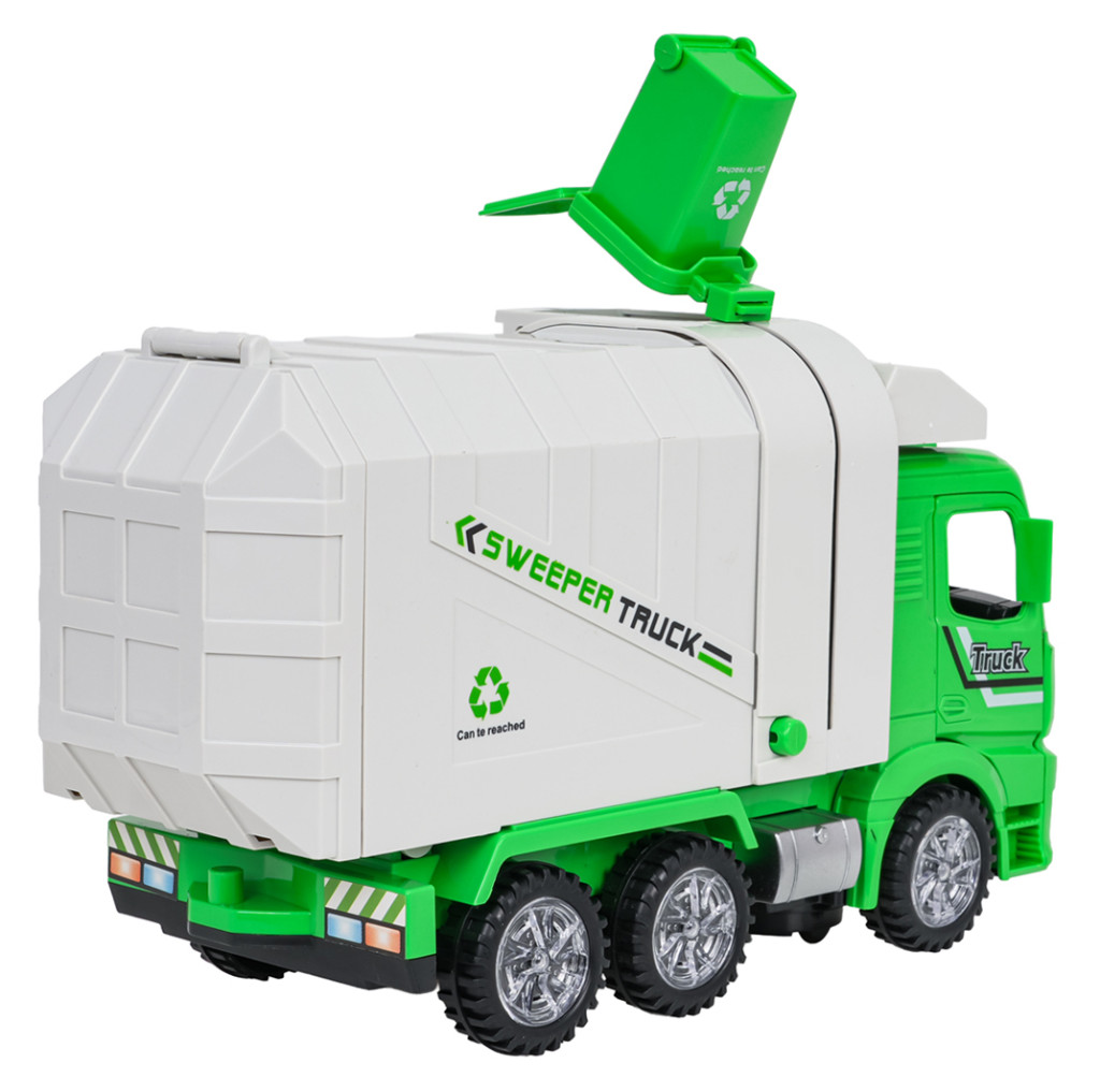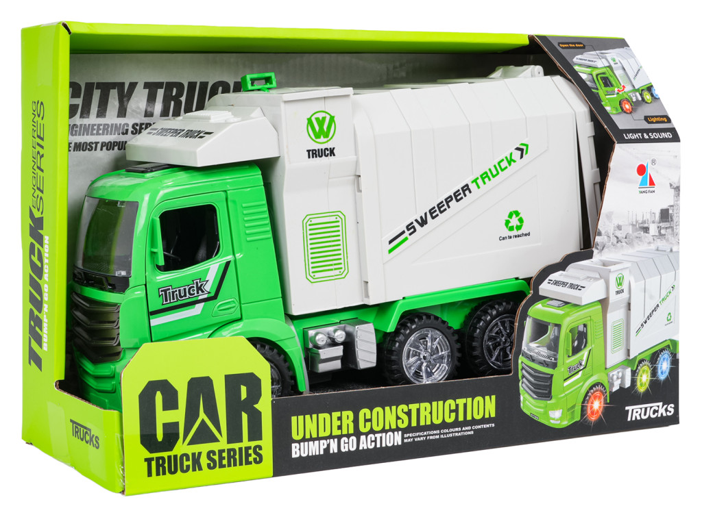 | Interaktywna śmieciarka z funkcją dźwięku i światła dla dzieci od trzeciego roku życia. Śmieciarka wykonana została z najlepszej jakości tworzywa sztucznego, z dbałością o szczegóły. Kółeczka pojazdu są podświetlane, a na spodzie znajduje się obrotowe kółeczko umożliwiające jazdę we wszystkich kierunkach. Zabawka wydaje odgłosy jazdy, klaksonu, hamowania i wesołej melodii. Podczas jazdy otwierają się też drzwi ciężarówki, podnosi i opuszcza kontener, świecą przednie światła. Kosz na śmieci dołączono do zestawu, można go zaczepić o bok śmieciarki i kiprować z niego śmieci bezpośrednio do zsypu, ponadto możemy podnosić kontener oraz jego tylną klapę (manualnie). Zabawka zasilana jest bateriami typu 3 x AA 1,5 V (brak w zestawie). Funkcje: - dla dzieci od trzeciego roku życia, - zabawka wykonana z najlepszej jakości tworzywa sztucznego, - efekty świetlne: podświetlane koła, przednie reflektory, - efekty dźwiękowe: odgłosy jazdy, hamowania, klaksonu, wesoła melodia, - funkcje elektryczne: jazda we wszystkich kierunkach, podnoszenie i opuszczanie kontenera, otwierane drzwi ciężarówki, - funkcje manualne: podnoszony i opuszczany kontener, otwierana klapa kontenera, kiprowanie kosza. |