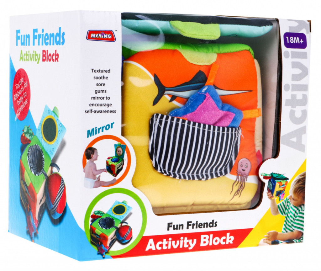 Sensoryczna kostka to propozycja dla dzieci od 18 miesiąca życia. Zabawka doskonale oddziałuje na wszystkie zmysły maluszka, dostarcza różnorodnych bodźców, pobudza mózg do pracy, doskonale stymuluje rozwój umiejętności motorycznych. Rozwija wyobraźnię, umiejętności poznawcze poprzez kształty i lusterko. Elementy szeleszczące i grzechoczące przyciągają uwagę i sprzyjają nauce chwytania. Pozytywnie wpływa na rozwój mowy, logicznego myślenia, koordynację oko-ręka.