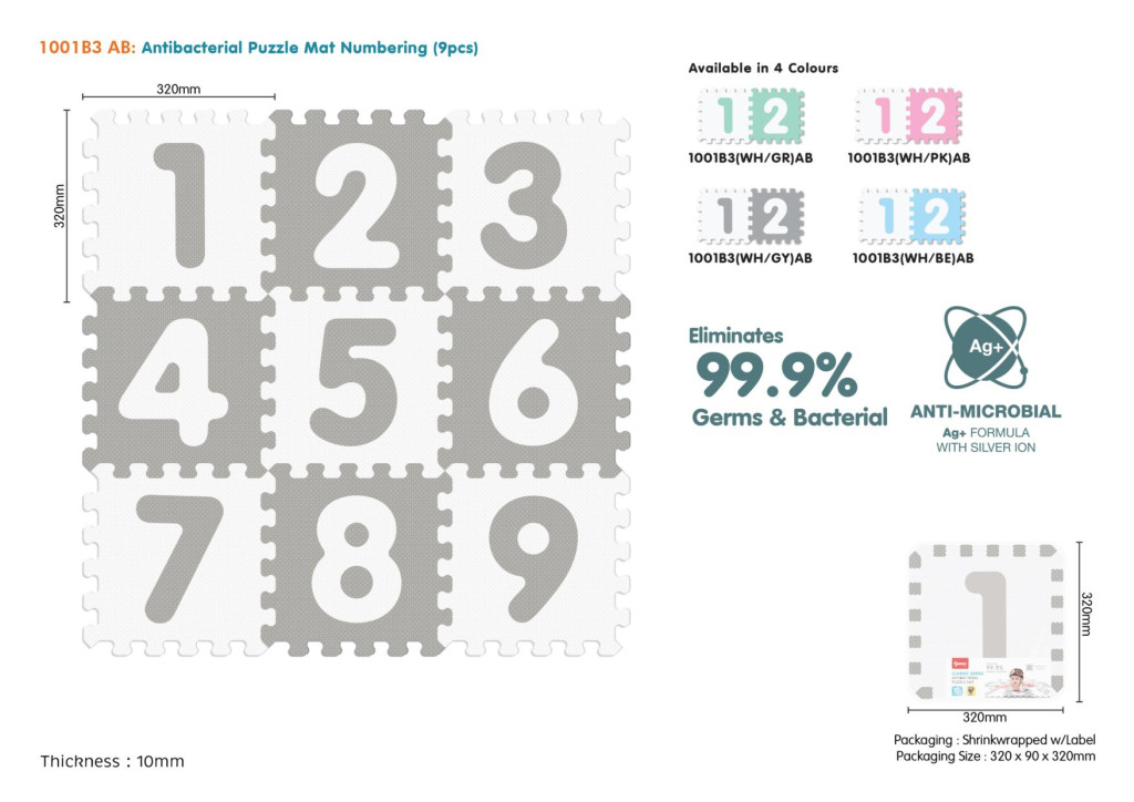Edukacyjne, antybakteryjne puzzle piankowe z cyferkami to propozycja dla najmłodszych od 10-go miesiąca życia. Puzzle wykonano z antybakteryjnego materiału zawierającego jony srebra zapobiegającemu zaleganiu bakterii na powierzchni maty. Formuła Ag+ z jonami srebra, eliminuje 99,9% bakterii i zarazków. Dla utrzymania czystości wystarczy przetrzeć każdy element wilgotną ściereczką. Zestaw składa się z 9 puzzli z których można ułożyć matę na podłogę chroniącą przed zimnem oraz amortyzującą upadki lub zbudować figury przestrzenne np. kostkę. Puzzle posiadają wyjmowane cyferki, dzięki czemu maluszek uczy się dopasowywać kształty. Właściwości puzzli piankowych: - wykonane z antybakteryjnego materiału zawierającego jony srebra zapobiegającemu zaleganiu bakterii na powierzchni maty, - formuła Ag+ z jonami srebra, eliminuje 99,9% bakterii i zarazków, - miękkie i przyjemne w dotyku, - struktura antypoślizgowa, - kolorowe, - wodoodporne, - łatwe w utrzymaniu czystości, - chronią przed zimnem od podłoża, - amortyzują upadki, - uczą przez zabawę – pobudzają wyobraźnię, koncentrację, percepcję wzrokowo-ruchową, logiczne myślenie, uczą kolorów, kształtów, cyferek oraz budowania figur przestrzennych. |