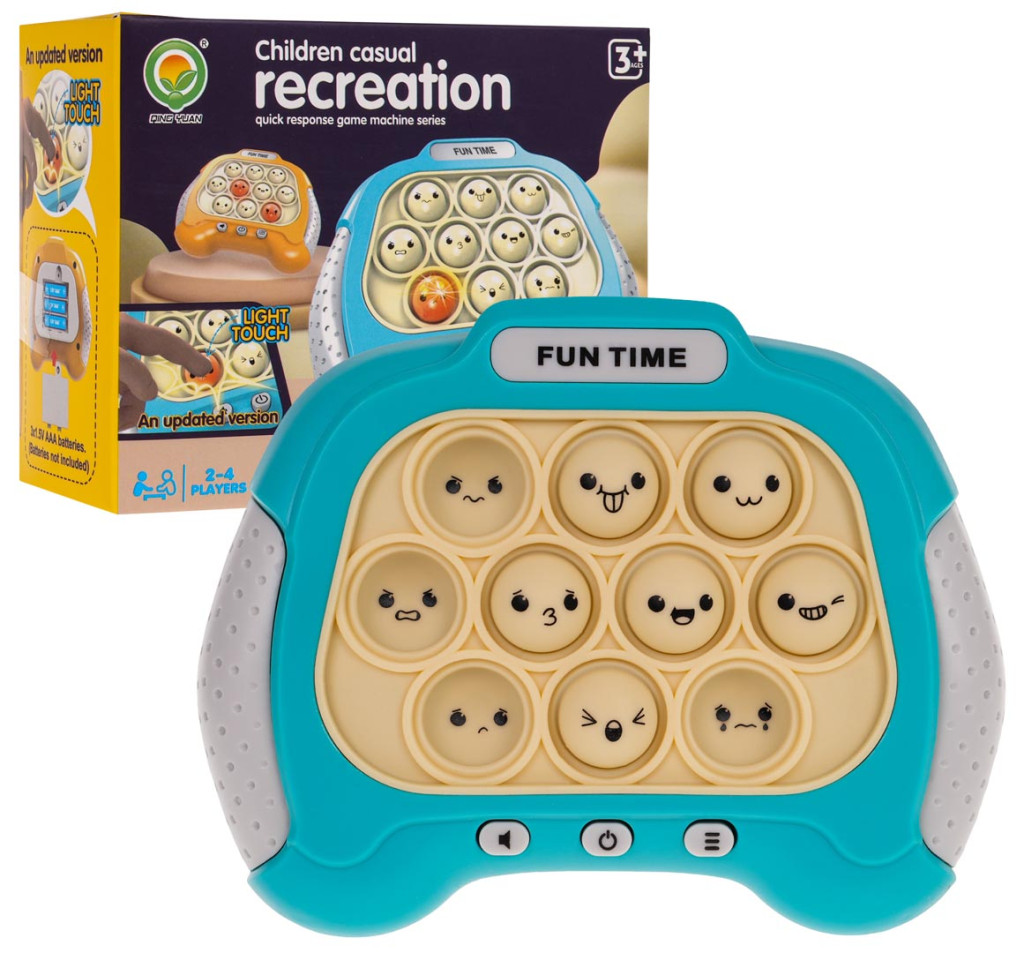 Interaktywna gra zręcznościowa z funkcją dźwięku i światła dla dzieci od 3-go roku życia. Gra z wyglądu przypomina pada i łączy w sobie grę Memory i Bubble Pop It. Zadaniem dziecka jest wciskanie odpowiednich bąbelków na padzie, w takiej kolejności jak wyświetlają się światełka na urządzeniu. Należy obserwować sekwencję wyświetlanych światełek, a następnie ją powtórzyć. Zabawka posiada 5 trybów rozgrywki, a podczas zabawy towarzyszy dzieciom muzyka. Gra ćwiczy zdolności motoryczne i poznawcze, pomaga się zrelaksować, poprawia pamięć i koncentrację. Zabawka zasilana jest bateriami typu 3 x AAA 1,5 V (brak w zestawie). Tryby rozrywki: Tryb przejścia Łącznie mamy 30 poziomów, a każdy poziom wymaga ukończenia 5 mniejszych poziomów. Wraz ze wzrostem liczby poziomów, liczba włączonych światełek wzrasta, a limit czasu dla każdego poziomu maleje. Tryb pamięci Łącznie mamy 9 poziomów, a na każdym poziomie gracze muszą ukończyć 5 mniejszych poziomów. Gracze muszą naciskać przyciski zgodnie z sekwencją świateł. Tryb punktacji Gracze mają minutę, by nacisnąć wszystkie podświetlające się światełka. Gracze mogą maksymalnie zyskać 100 punktów. Tryb wieloosobowy Każdy z graczy gra po jednym poziomie i przechodzi do kolejnego. Wraz ze wzrostem liczby poziomów zwiększa się liczba włączonych świateł, a czas na wykonanie zadania skraca się. Tryb zadawania pytań Losowe dodawanie i odejmowanie w zakresie 10. Np. 3 - 2 to 1. Naciskamy klawisz pierwszy. Funkcje zestawu: - łączy w sobie grę Memory oraz Bubble Pop It, - posiada funkcję dźwięku, - posiada funkcję światła, - pozwala ćwiczyć pamięć i koncentrację, a zarazem zrelaksować się, - ćwiczy sprawność rączek dzieci, - znakomicie wykonana, - bezpieczna dla dzieci od 3-go roku życia, - posiada 5 trybów rozrywki. |