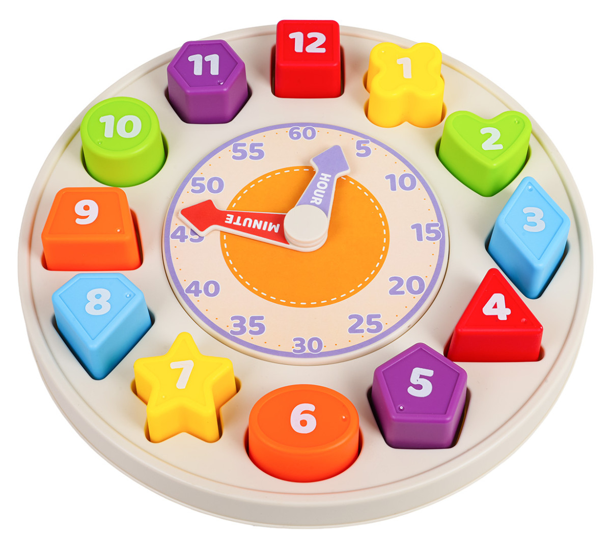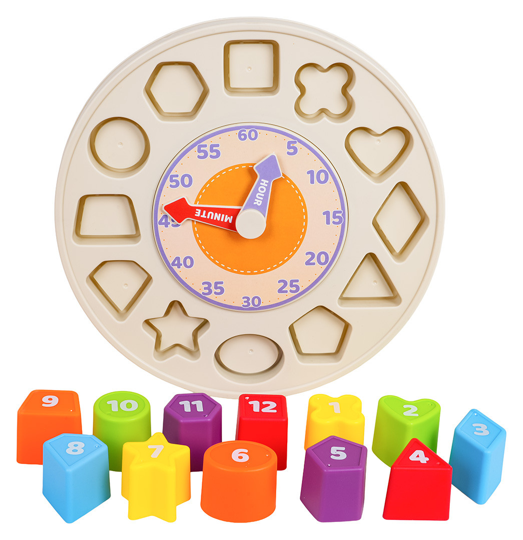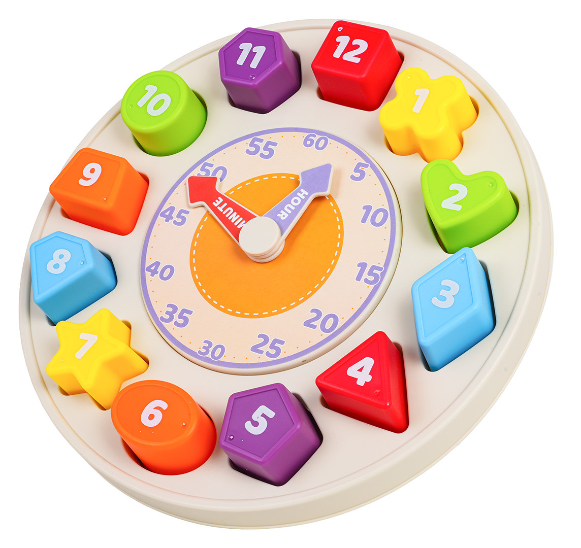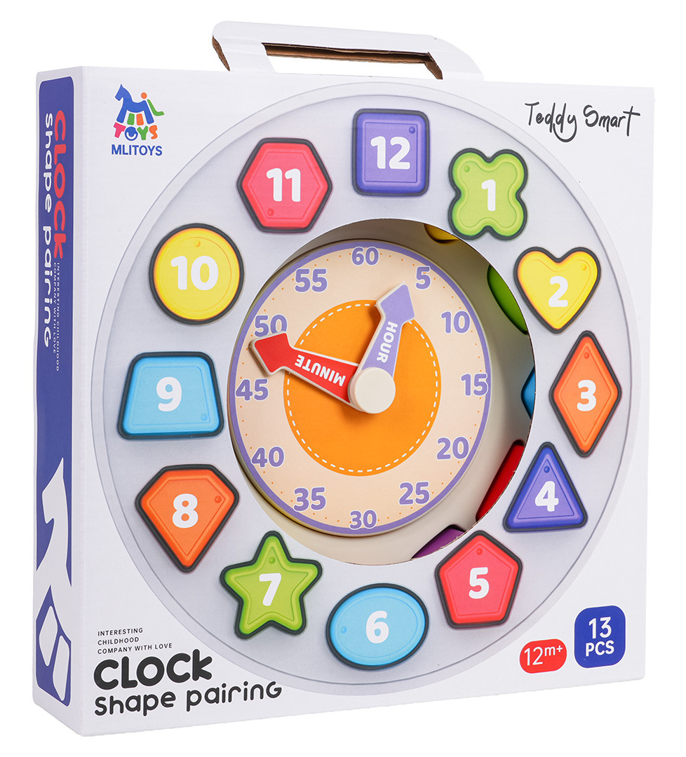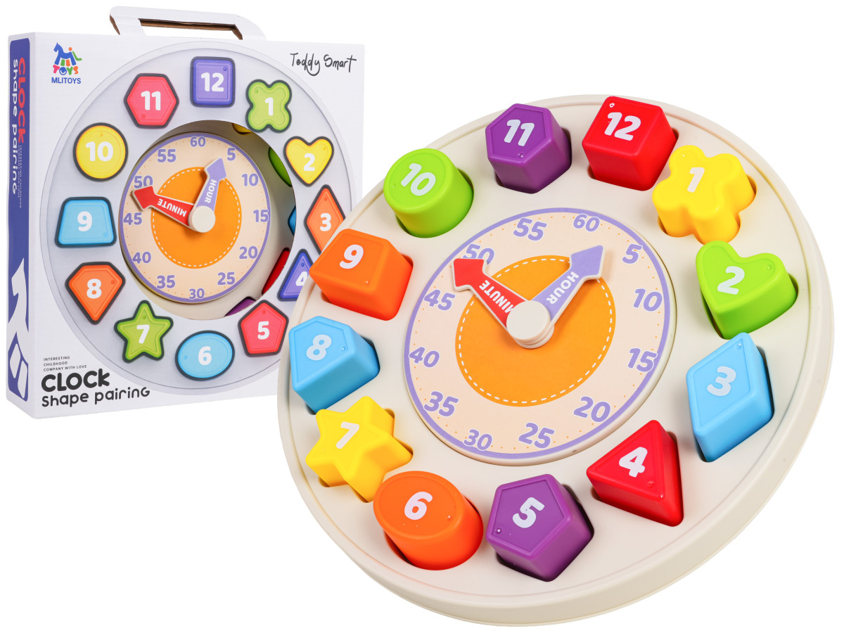 Edukacyjny zegar z sorterem kształtów dla najmłodszych od dwunastego miesiąca życia. Zestaw wykonany został z bezpiecznych materiałów w żywych kolorach. Na tarczy zegara znaleźć możemy ruchome wskazówki oraz numerki od 5 do 60. Po zewnętrznej stronie tarczy znajduje się sorter kształtów. We wgłębieniach o różnych kształtach maluszek może umieścić aż 12 klocków. Każdy klocuszek oznaczony jest numerem od 1 do 12. Dzięki temu zestawowi, przez zabawę, maluszek oswoi się z zegarem, nauczy rozpoznawać minuty i godziny, pozna różne kształty i kolory.