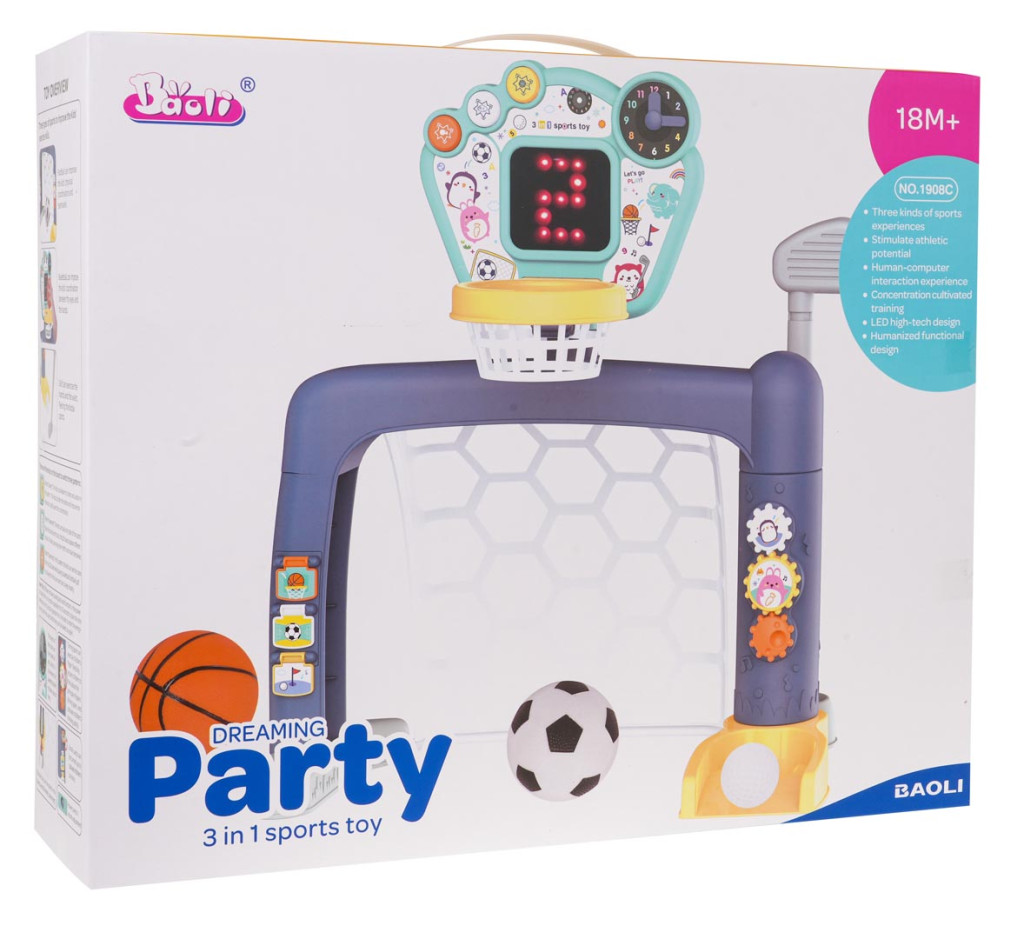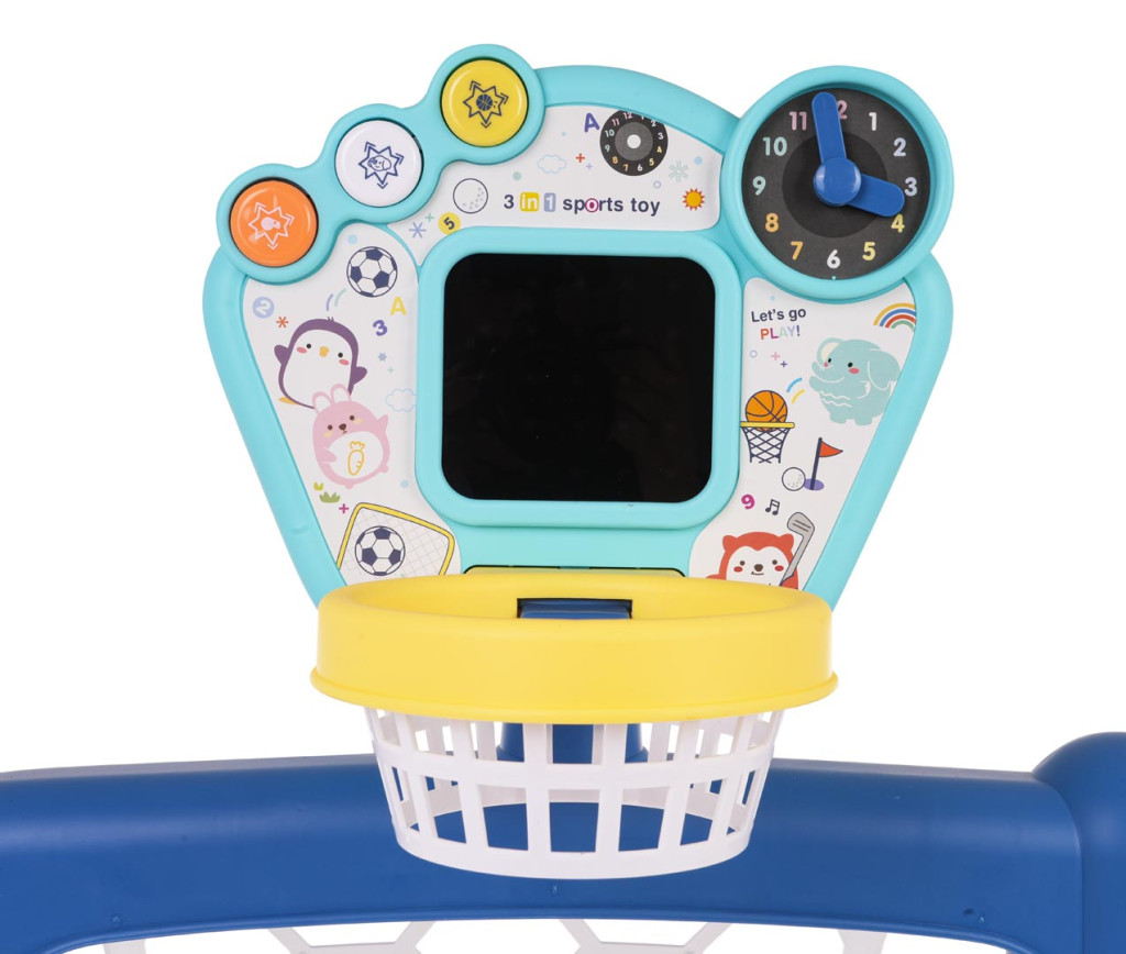 Interaktywny zestaw 3w1 do gry w piłkę nożną, koszykówkę i golf, dla dzieci od 18-go miesiąca. Na planszy znajdują się trzy klawisze, do przełączania pomiędzy trybami. Zabawka zasilana jest bateriami typu 3 x AA 1,5 V (brak w zestawie). Tryby zabawki: - przycisk ZABAWA, dzieci słuchają poleceń do wykonania, a następnie je realizują, - przycisk RUCH, uruchamia obrazki na tablicy wraz z dźwiękami i muzyką, - przycisk DOŚWIADCZENIE, maluch kontroluje wyniki na tablicy. Funkcje zabawki: - odpowiednia dla dzieci powyżej 18-go miesiąca życia, - 3 gry do wyboru: golf, koszykówka, piłka można, różnorodne możliwości zabawy, - zegar z ruchomymi wskazówkami do nauki godzin, - kółka zębate do ćwiczenia precyzji, - przekładane książeczki, - panel interaktywny z efektem dźwięku i światła. |