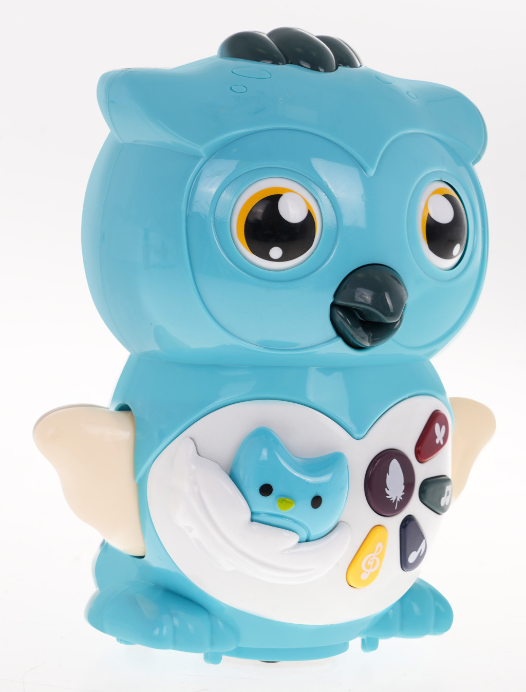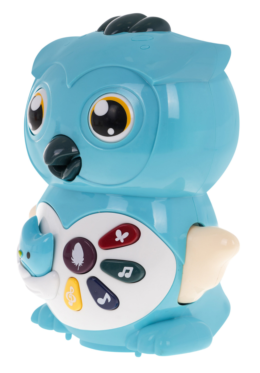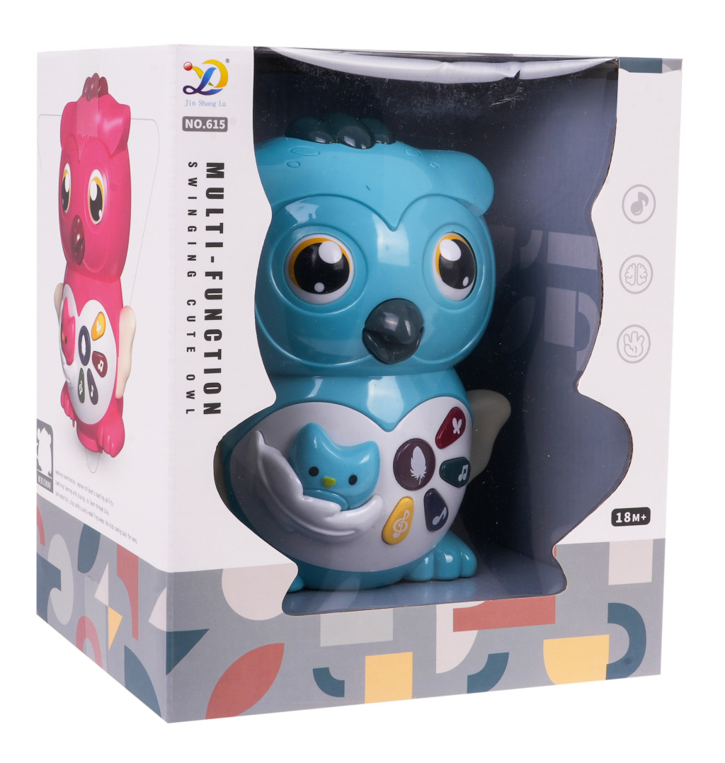 Interaktywna sowa z funkcją dźwięku i światła to propozycja dla dzieci od 18-go miesiąca życia. Zabawka posiada obrotową stopkę na spodzie, dzięki której jeździ i odbija się od przeszkód. Oczka, pyszczek i skrzydełka sówki są ruchome. Dodatkowo skrzydełka są również podświetlane (mrugające czerwone światełko). Na brzuszku sówki umiejscowiono panel multifunkcyjny z odgłosami bicia serca, odgłosami dżungli, odgłosami zwierzątek oraz różnymi melodyjkami. Zabawka zasilana jest bateriami typu 3 x AA 1,5 V, baterii brak w zestawie. Interaktywna sówka stymuluje rozwój wzroku, słuchu, mowy, inteligencję emocjonalną i wrażliwość dziecka. Funkcje: - sowa przemieszcza się na obrotowym kółku (przycisk na górze sowy), - trzepocze skrzydełkami, - oczy ruszają się w górę i w dół, - poruszają się usta, - odgłos bicia serca (przycisk z piórkiem), - trzy odgłosy zwierząt (przycisk z melodyjką), - odgłos dżungli (przycisk z motylkiem), - cztery podkłady muzyczne (przycisk z podwójną nutką), - dziesięć różnych odgłosów (przycisk z nutką), - podświetlane skrzydełka sówki, po naciśnięciu na jakikolwiek przycisk. |