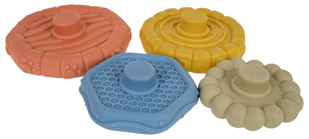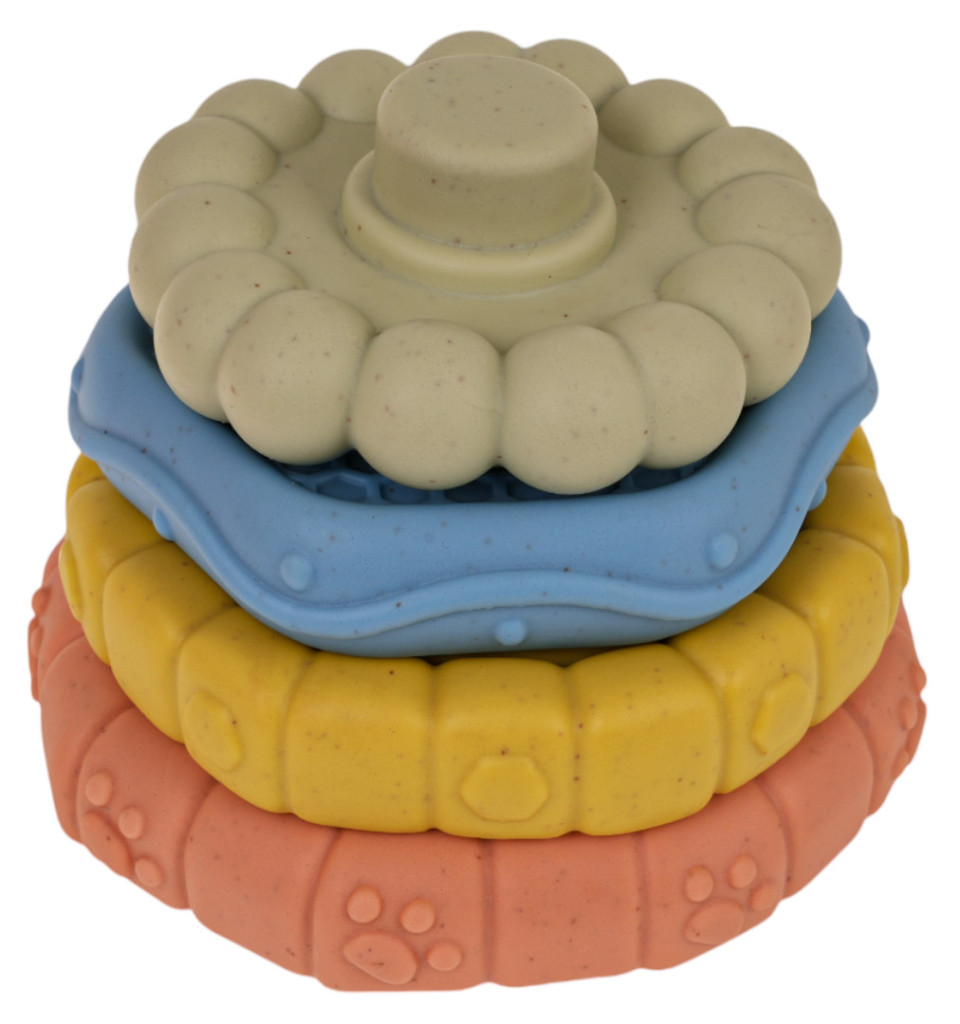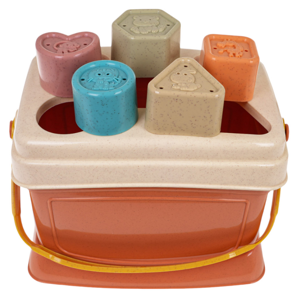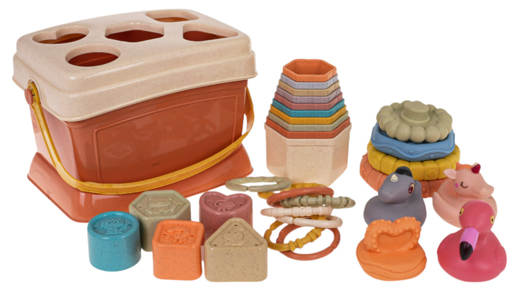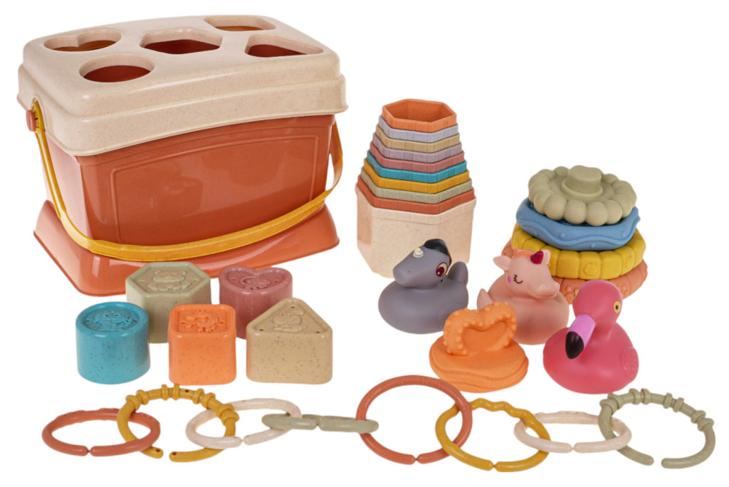 | - sorter, box z wygodną rączką do przenoszenia, - 4 klocki o różnych kolorach i kształtach, - 3 gumowe zwierzaki, - 10 elementów konstrukcyjnych piramidki, - 8 okręgów do wpinania i tworzenia łańcuszka - 5 gumowych elementów na piramidkę. |