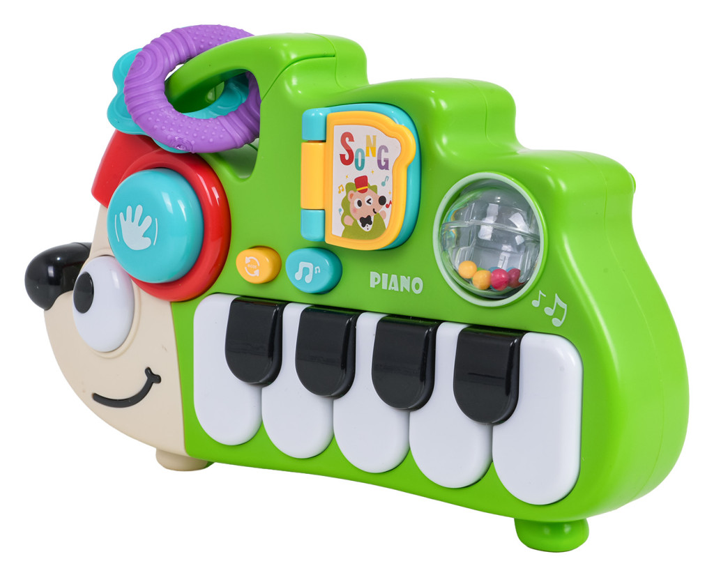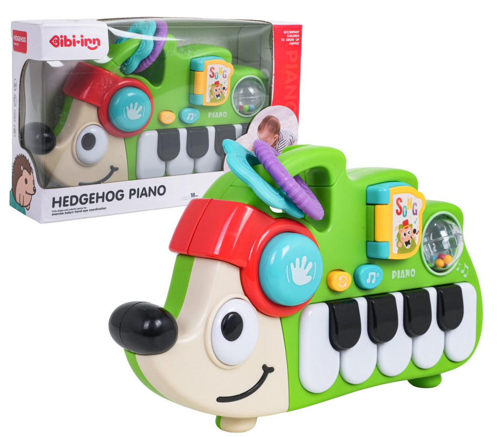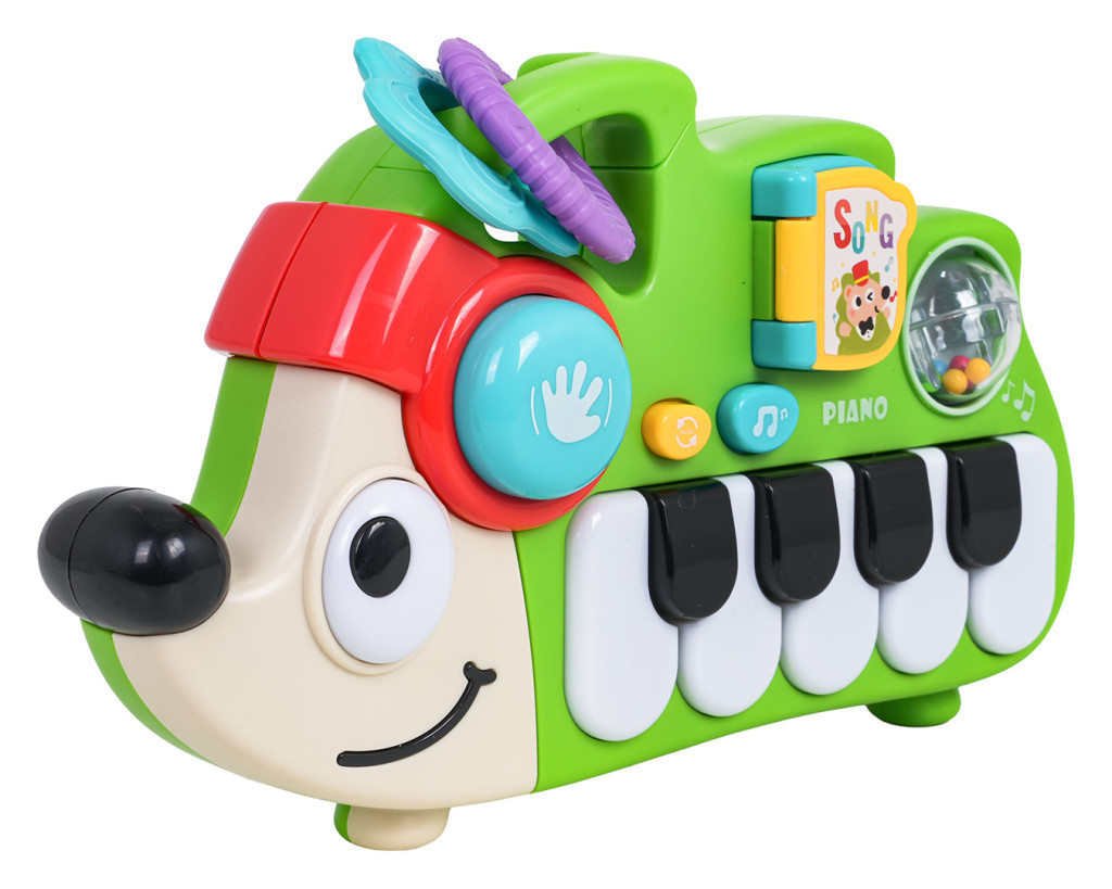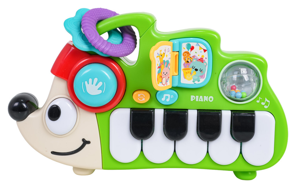 Pianinko o kształcie jeża dla maluszków od osiemnastego miesiąca życia. Zabawka wykonana została z najlepszej jakości materiałów i nie posiada ostrych zakończeń. Żywe kolory przyciągają uwagę dziecka i wzbudzają ciekawość. Pianinko posiada pięć białych klawiszy i cztery czarne. Nad klawiszami umiejscowiono przycisk ze zmianą trybu i włącznikiem melodii. Wyżej znajduje się książeczka do przekładania, bębenek, grzechotka z kolorowymi kuleczkami i gryzak. Zabawka zasilana jest bateriami typu 3 x AAA 1,5V (brak w zestawie).