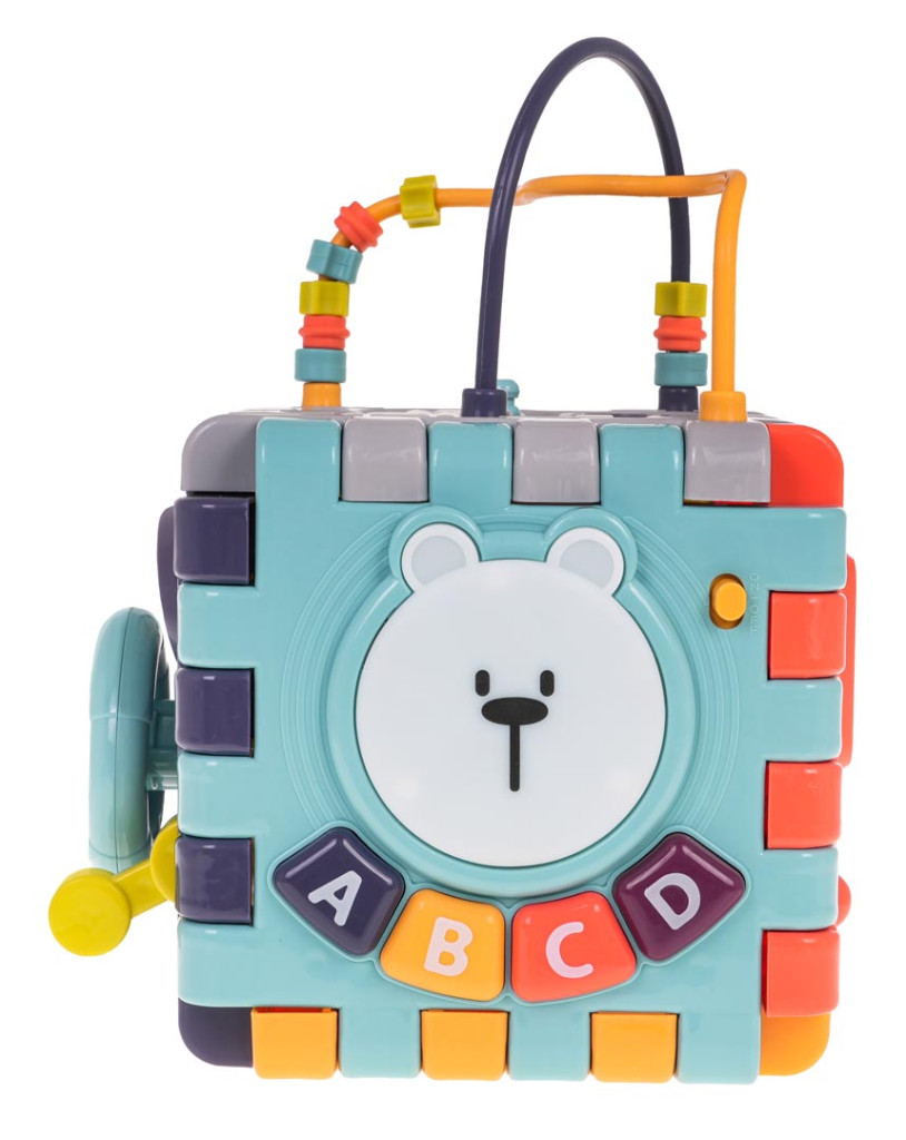 Wielofunkcyjna interaktywna kostka z efektami dźwiękowymi i świetlnymi dla dzieci od 18-go miesiąca życia. Każda ścianka boxu zapewni dziecku wiele frajdy i interaktywnej zabawy. Efekty dźwiękowe i świetlne oraz bogactwo kolorów, przyciągnie wzrok maluszka i zachęci do zabawy. Kostkę możemy rozkładać i bawić się poszczególnymi elementami na płasko. Zabawka zasilana jest bateriami typu 3 x AAA 1,5 V (brak w zestawie). Opis ścianek boksu: - ścianka z ruchomą kierownicą i ruchomą skrzynią biegów. Maluszek może poruszać kierownicą i atrapą drążka zmiany biegów.