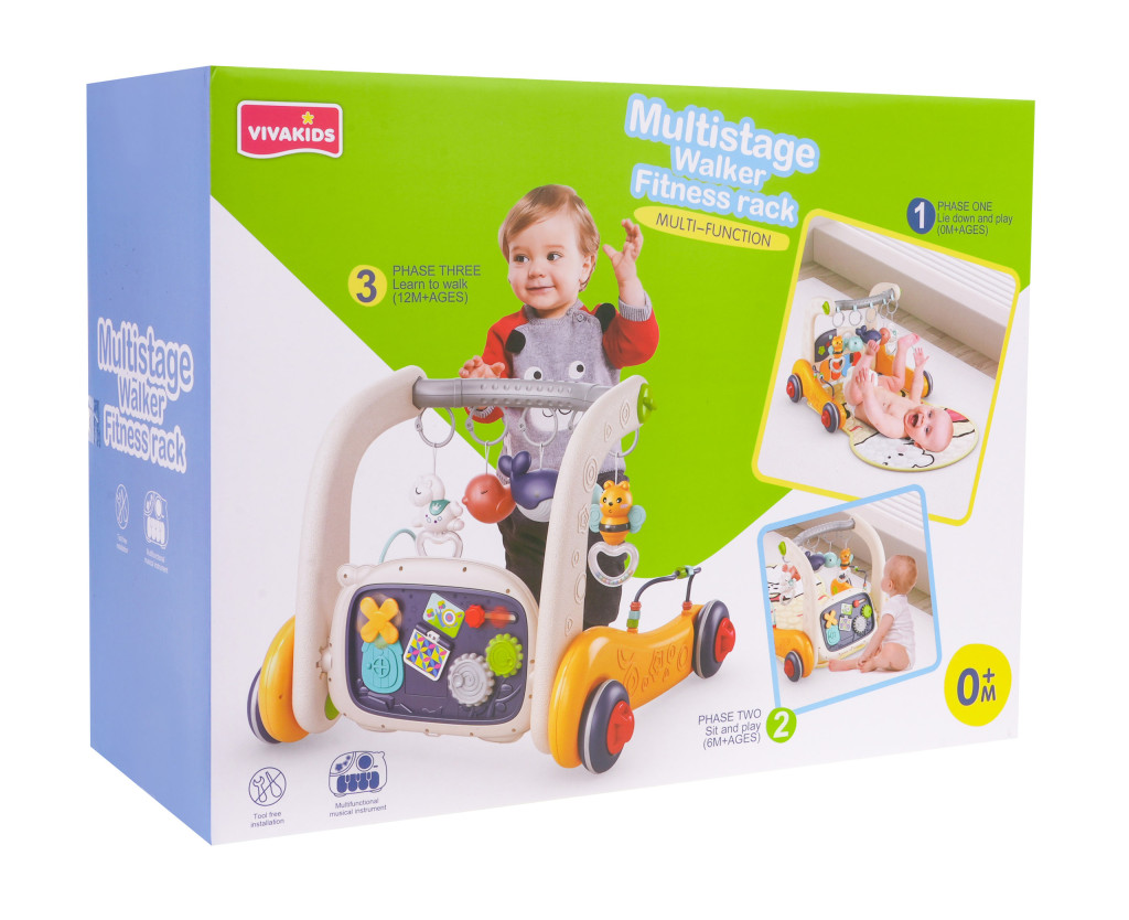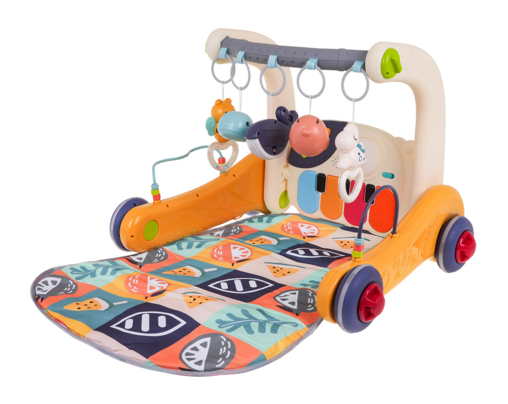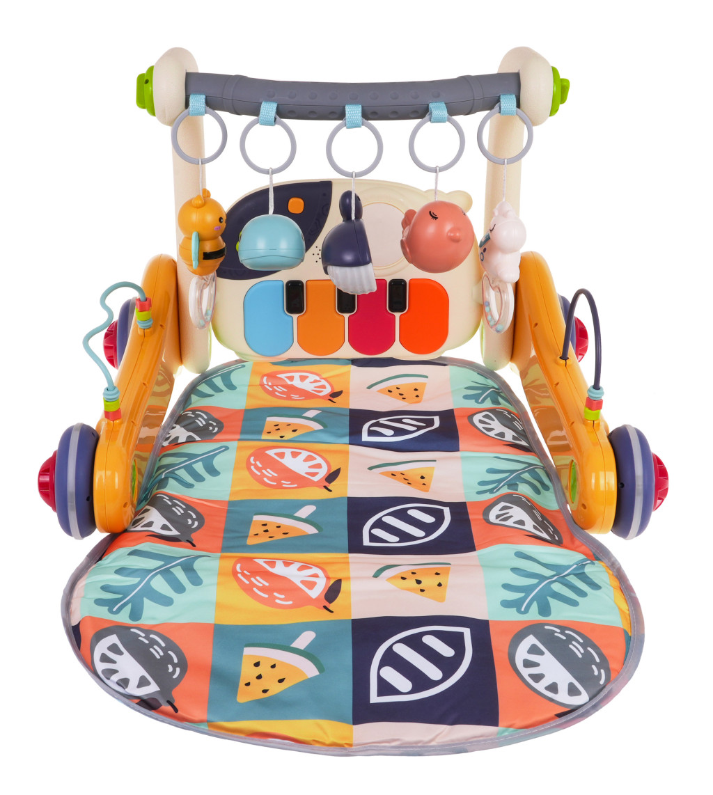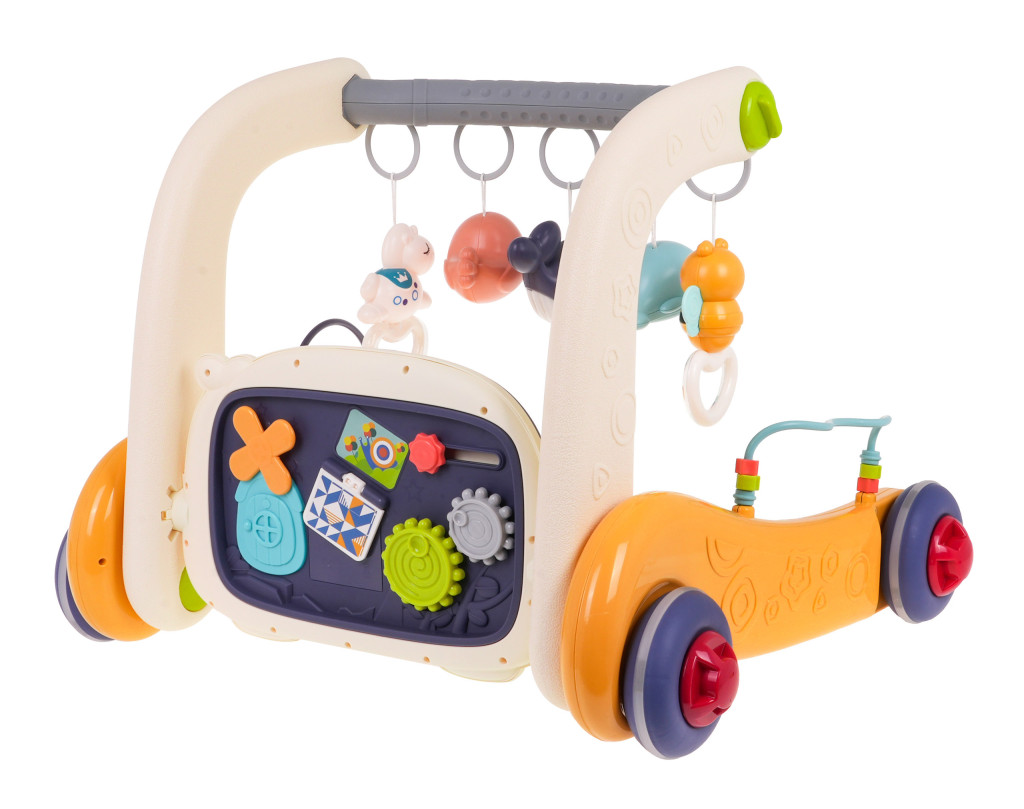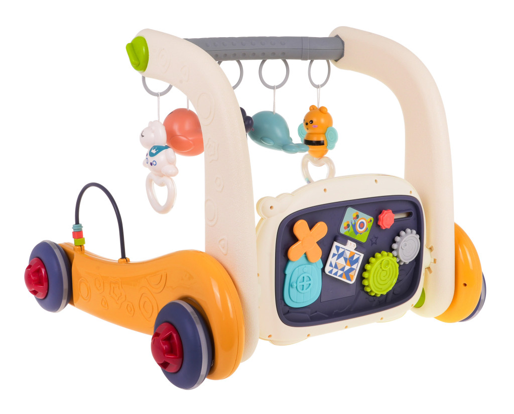 1. Panel - obrotowe zębatki, które podczas obracania wydają dźwięk, - suwak z gwiazdką, który podczas przesuwania wydaje dźwięk, - książeczka do przekładania, - domek z ruchomym wiatraczkiem, - regulacja głośności, - przycisk z nutką i przycisk z kwadracikiem uruchamia melodie, którym towarzyszy mruganie klawiszy, - kolorowe pianinko. - kółko uruchamiające mikser i efekty świetlne. 2. Boki pchaczyka: - przekładanki z koralikami. 3. Zawieszki na pałąku górnym - jednorożec z grzechotką, - foka z grzechotką, - delfinek z podświetleniem, - delfinek z grzechotką, - pszczółka z grzechotką. |