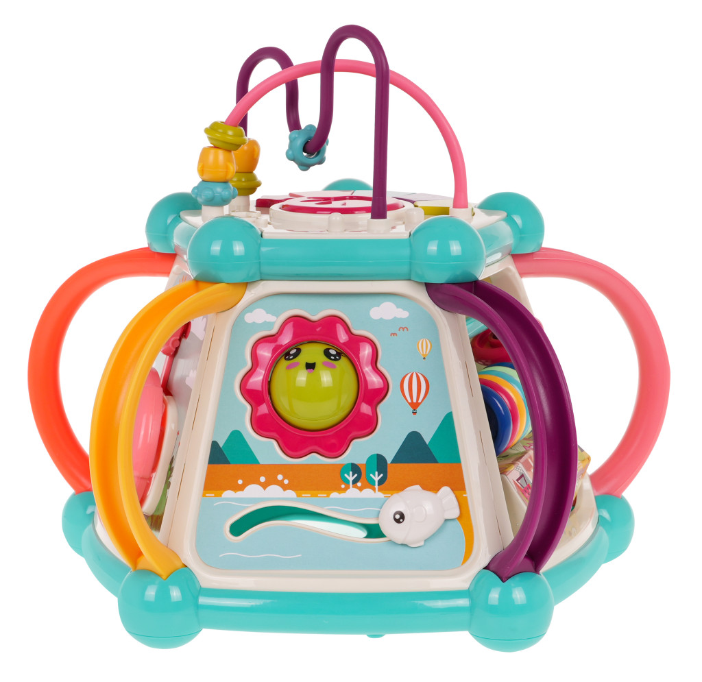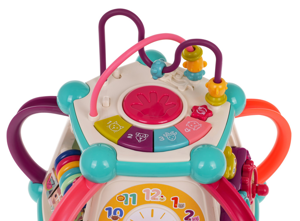 Interaktywna kostka 7w1 dla dzieci od 6-go miesiąca życia. Kostka wykonana została z plastiku najwyższej jakości w żywych kolorach zachęcających malucha do odkrywania i zabawy. Zabawka nie posiada ostrych krawędzi, jest w pełni bezpieczna dla dziecka. Kostka posiada siedem ścianek, z których każda oferuje inny rodzaj zabawy. Poprzez zabawę dziecko rozwija zdolności manualne, koordynację wzrokowo-ruchową, uczy się rozwiązywać problemy. Zabawka zasilana jest bateriami typu 3 x AA 1,5 V (brak w zestawie) Ścianka górna z przeplatanką, zmianą trybów zabawy i pianinkiem z różnymi dźwiękami Na górze boxu znajduje się kolorowa przeplatanka z koralikami sensorycznymi, włącznik z dwustopniową regulacją głośności, czerwony bębenek z obrazkiem rączki, cztery przyciski z odgłosami zwierzątek (pieska, kotka, owieczki czy kaczuszki) lub melodiami w zależności od trybu. Czerwony przycisk z gwiazdką uruchamiający 4 różne tryby pianinka.