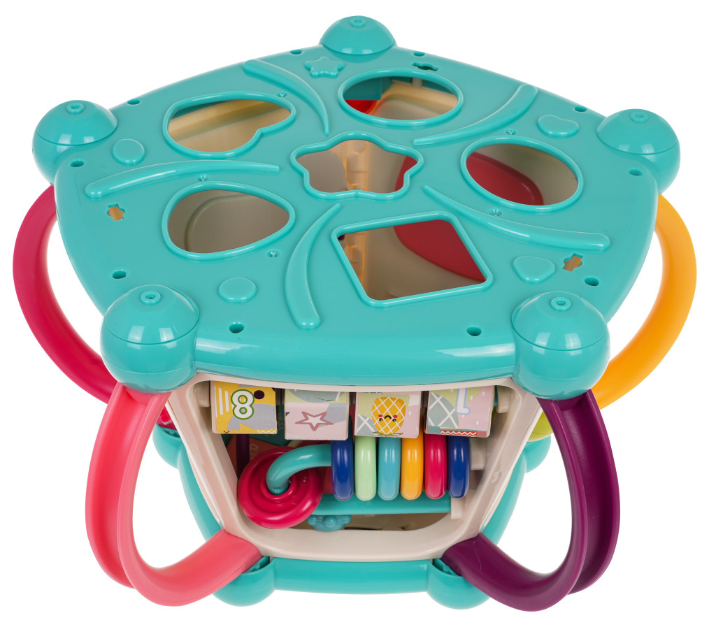 Ścianka z liczydłem Na ściance znajduje się kolorowe liczydło z obrotowymi kółkami oraz obrotowe klocuszki do nauki liczenia, kolorów, owoców, zwierzątek, liczb. Ścianka z zegarem z ruchomymi wskazówkami Na ściance znajduje się duży zegar z ruchomymi wskazówkami, cyferkami i obrazkami zwierzątek. Ścianka z kołami zębatymi Na ściance znajdują się dwa kolorowe koła zębate i ruszający w lewą i prawą stronę głową miś. Ścianka z kierownicą Na ściance znajduje się kierownica i autko. Podczas poruszania kierownicą autko porusza się w prawo i w lewo. Ścianka z rybką i słoneczkiem Na tej ściance znajduje obrotowe słoneczko i rybka która „płynie slalomem”. Ścianka dolna z funkcją sortera + 6 klocków Ścianka z sorterem kształtów i 6 klocuszków do dopasowania. Funkcje zabawki: - odpowiednia dla dzieci od 6-go miesiąca życia, - wykonana z bezpiecznych materiałów najwyższej jakości, - bogactwo kolorów zachęca do zabawy i nauki, - każda ze ścian skrywa inne tajemnice, - efekty dźwiękowe: odgłosy zwierzątek, muzyka, bębenek, odgłosy kręcenia się zębatek, grzechotka w słoneczku, terkotanie podczas przesuwania rybki, - efekty świetlne: bębenek , podświetlane klawisze, - ruchome elementy: koraliki na przekładance, słoneczko, rybka, koraliki na liczydle, obrotowe klocuszki, wskazówki zegara, koła zębate z misiem, kierownica z autkiem, - przekładanki, - mnóstwo możliwości zabawy, - sorter z klocuszkami, - nauka przez zabawę. |