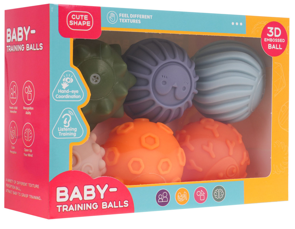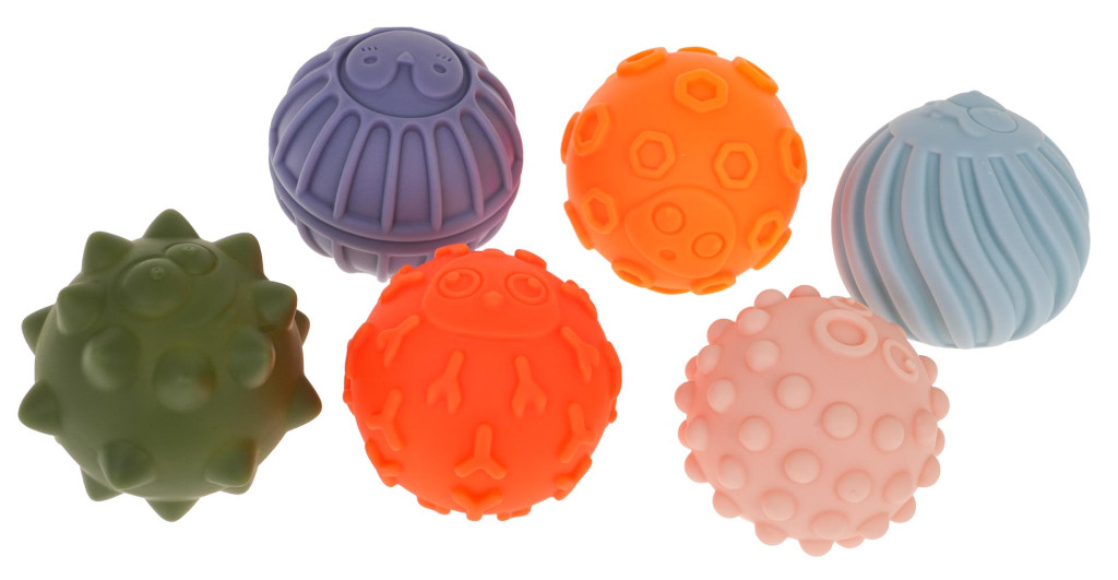 Zestaw 6 kolorowych piłek sensorycznych dla maluszka od 18-go miesiąca życia. Różnorodna kolorystyka pobudza zmysły dziecka, a różnorodne kształty zachęcają do kreatywnej zabawy. Dzięki zróżnicowanej fakturze każda piłeczka dostarcza dziecku innych wrażeń czuciowych. Piłeczki mogą być używane w celach terapeutycznych, edukacyjnych lub jako zabawki sensoryczne dla dzieci. Podczas naciskania na piłeczkę, wydobywa się z niej dźwięk.