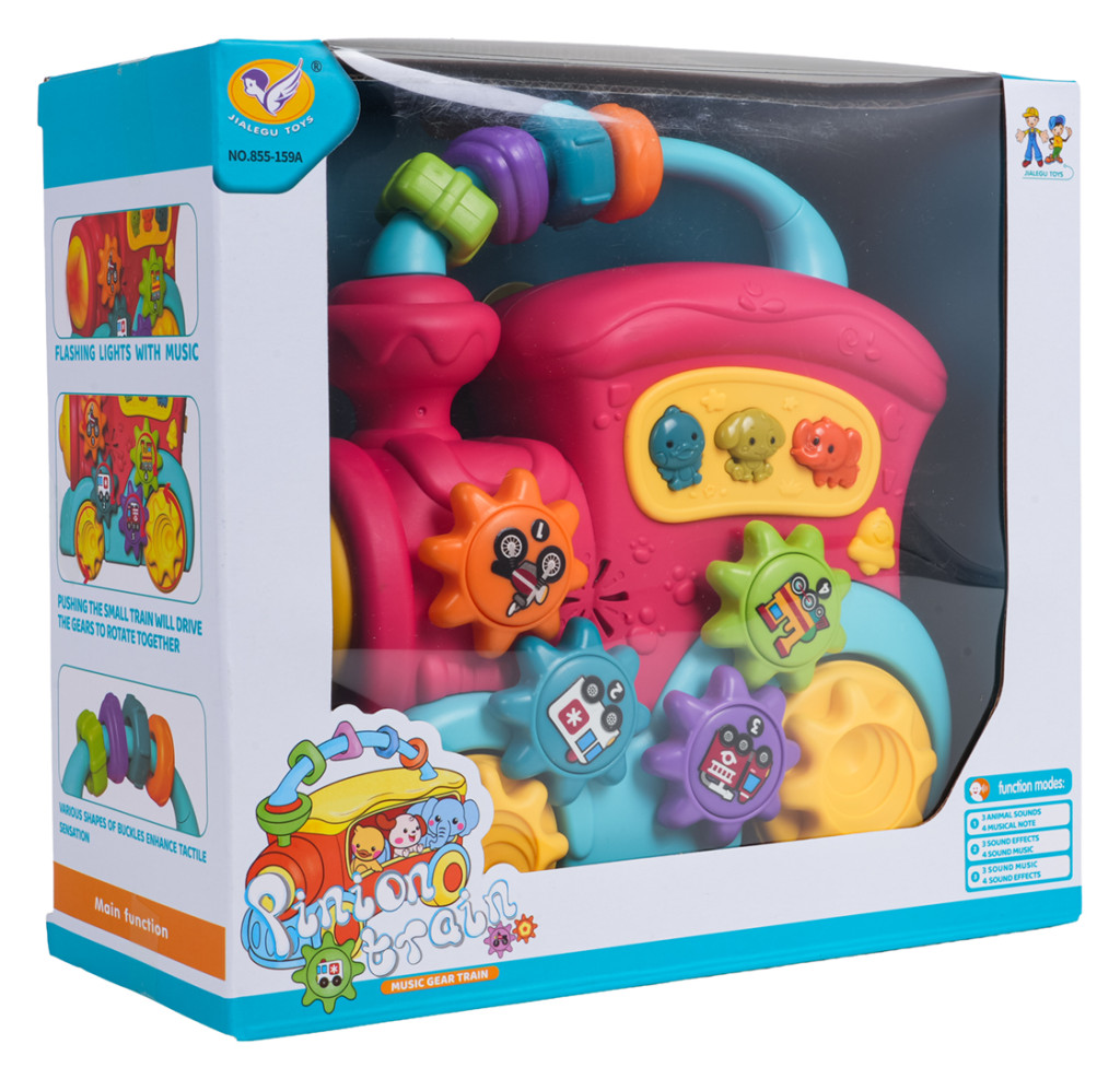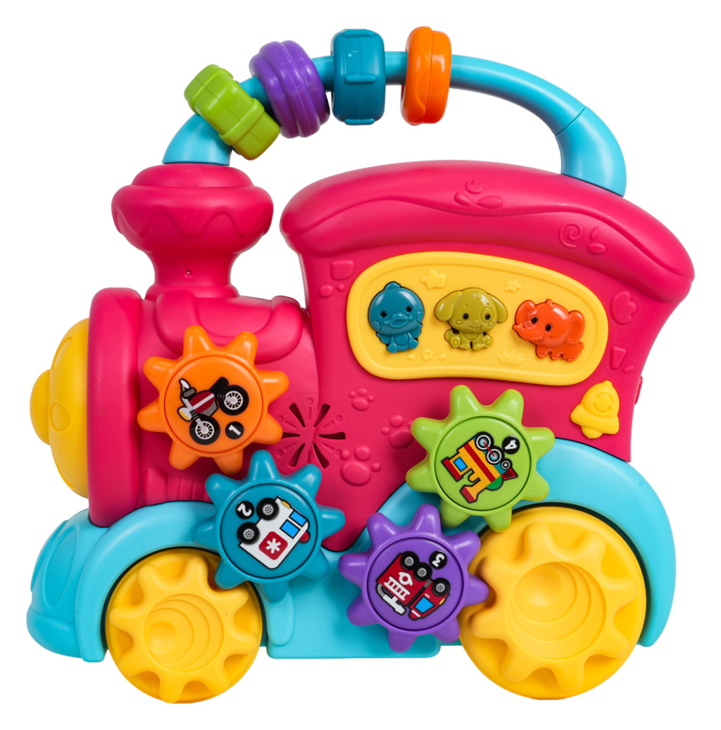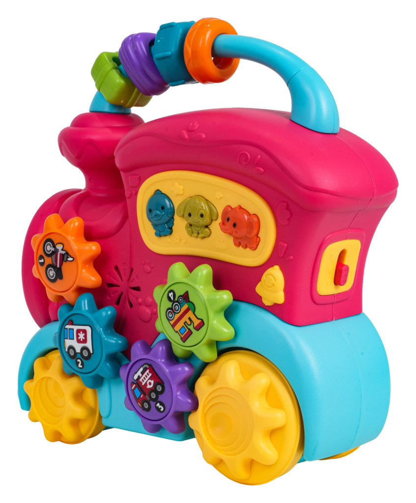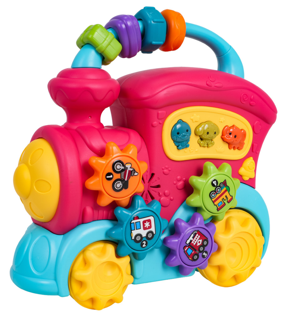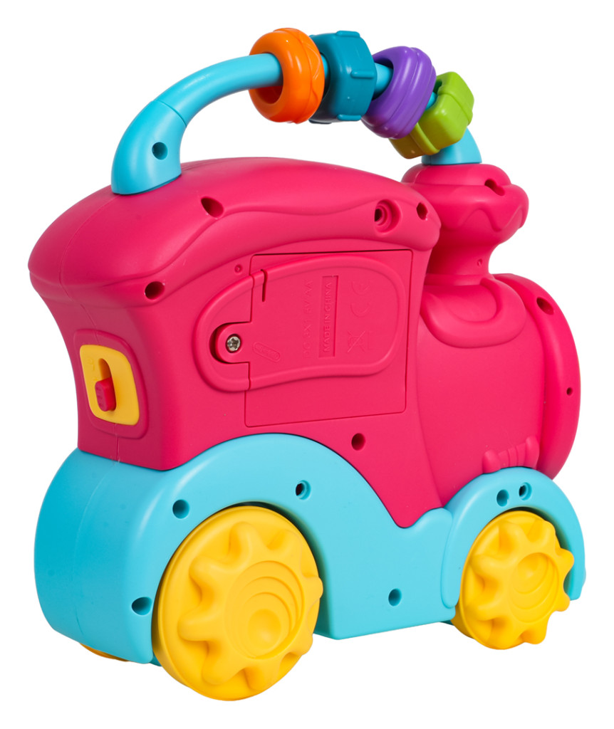 | Interaktywna zabawka, pociąg z funkcją dźwięku i światła dla dzieci od dwunastego miesiąca życia. Zabawka wykonana została z najlepszej jakości tworzywa sztucznego w żywych kolorach. Jest bezpieczna dla maluszka, nie posiada ostrych krawędzi. Zabawka oferuje wiele atrakcji i stymuluje dziecko na różnych płaszczyznach. Z tyłu pociągu znajduje się dwustopniowa regulacja głośności, na dachu przekładanka z sensorycznymi koralikami, w bocznej części pociągu zaś kółeczka zębate z rysunkami pojazdów i przyciski ze zwierzątkami. Podczas przesuwania pociągu po podłożu uruchamia się mechanizm kół zębatych znajdujących się na zabawce, kręcą się one, wydając dźwięk grzechotania. Po naciśnięciu na koło zębate usłyszymy odgłos nuty. Przyciski ze zwierzaczkami uruchamiają odgłosy kaczki, psa czy słonia, a także różne dzwonki czy melodie, zależnie od ustawionego trybu (przycisk z dzwoneczkiem). Zabawkowa ciuchcia posiada podświetlany reflektor i zasilana jest bateriami typu 3 x AA 1,5V (brak baterii w zestawie). Funkcje: - dla dzieci od dwunastego miesiąca życia, - zabawka wykonana z najlepszej jakości materiałów w żywych kolorach, - efekty dźwiękowe: dźwięki zwierząt (słoń, pies, kaczka), wesołe melodyjki, odgłosy obrotu kół zębatych, odgłosy nut, - efekty świetlne: podświetlany reflektor, - regulacja głośności, - przekładanka z kołami zębatymi. |