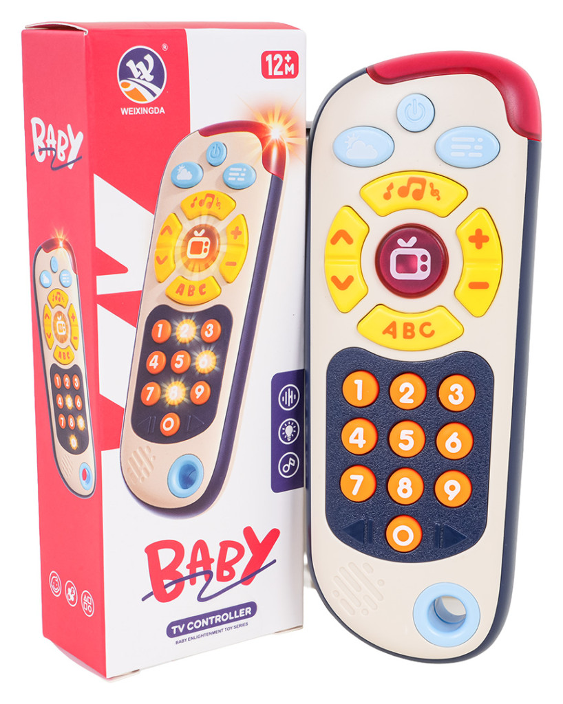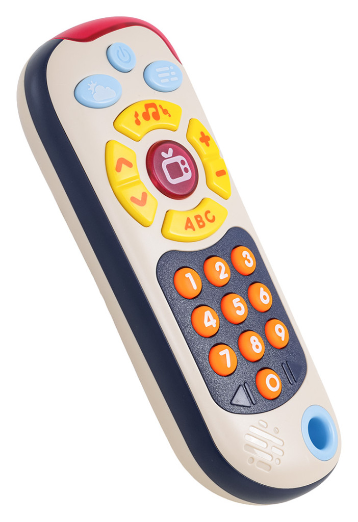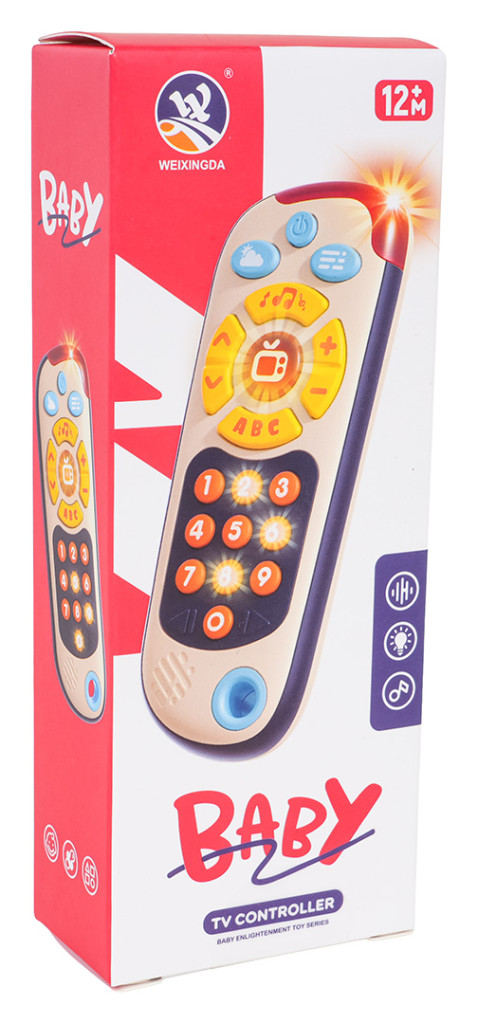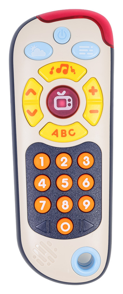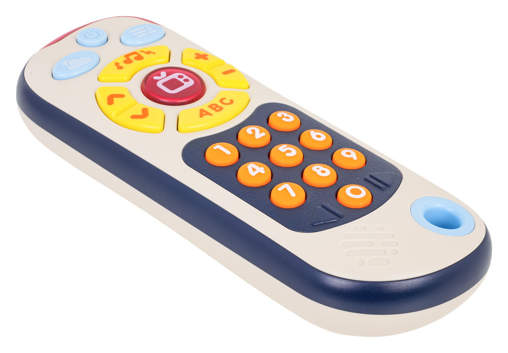 | Interaktywny pilot dla maluszków od dwunastego miesiąca życia. Zabawka wykonana została z najlepszej jakości tworzywa sztucznego i nie posiada ostrych zakończeń. Bogactwo kolorów i funkcji przyciąga uwagę maluszka i zachęca do interaktywnej zabawy. Na górze pilot posiada podświetlenie, są też trzy niebieskie przyciski: włącznik/wyłącznik, przycisk z chmurką uczący rozróżniać pogodę (słonecznie, wietrznie, deszczowo) oraz przycisk z wyborem trybów: numery, kanały telewizyjne i gra ubij kreta. Niżej znajduje się żółte koło z przyciskami, a w centrum koła podświetlany przycisk z telewizorem. Przycisk z nutką i ABC uruchamia melodie, +/- to regulacja głośności a ^/v zmienia między trybami. Na dole znajduje się klawiatura numeryczna od 0 do 9. W trybie numerycznym po naciśnięciu na dany numer słyszymy jego nazwę w języku angielskim oraz odgłos zwierzątka. W trybie telewizyjnym po naciśnięciu na przycisk usłyszymy odgłosy: muzyka, odgłosy zwierzątek, powitanie, emocje, nazwy miesięcy, żywności, pór roku, tygodni. W trybie ubij kreta, podświetlają się przyciski, a maluch musi je zręcznie naciskać. Zabawka zasilana jest bateriami typu 2 x AAA 1,5V (brak w zestawie).