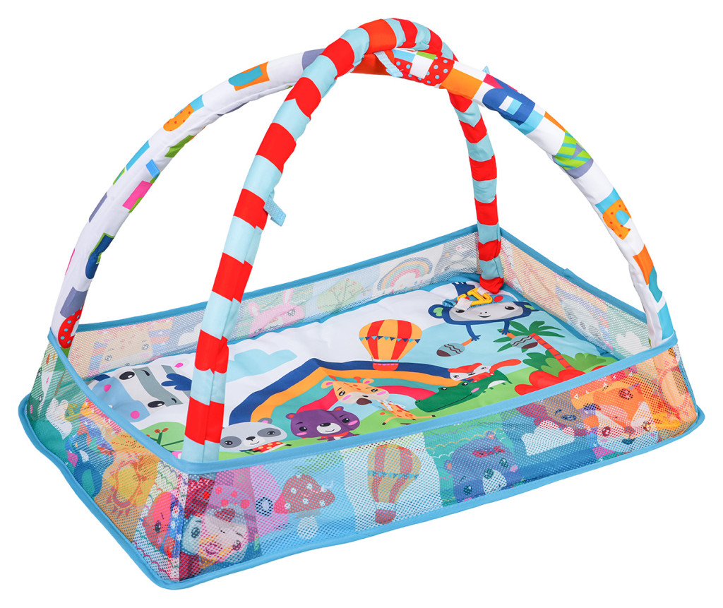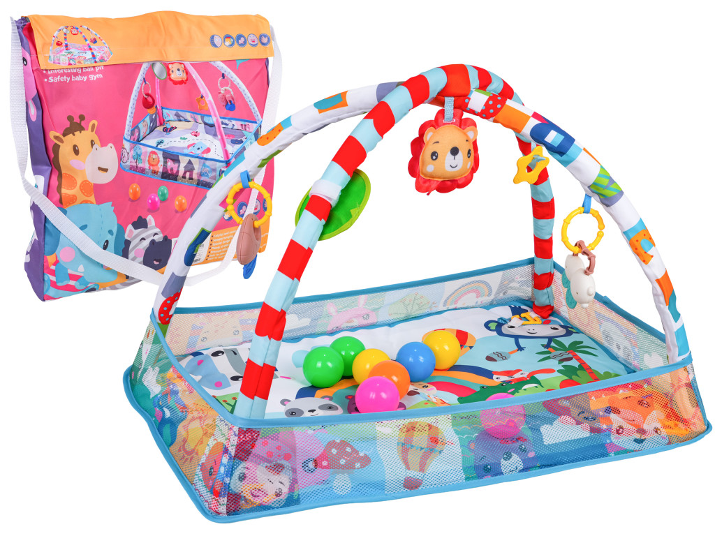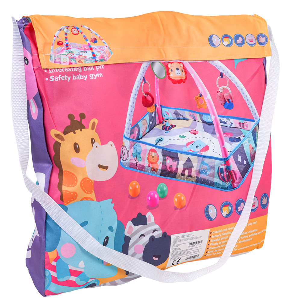 | Edukacyjna mata do leżenia, suchy basen dla dzieci od pierwszych dni życia. Mata wykonana została z bezpiecznych dla maluszka materiałów w żywych kolorach przyciągających wzrok dziecka. Materiał, z którego wykonano matę, jest łatwy w utrzymaniu czystości, konstrukcja jest solidna i stabilna. Na pałąku znajdują się odczepiane zawieszki, które można przyczepić również do łóżeczka czy fotelika. W zestawie znaleźć możemy także kilka piłeczek. Cały zestaw zapakowany jest w opakowanie w kształcie torebki z paskiem.