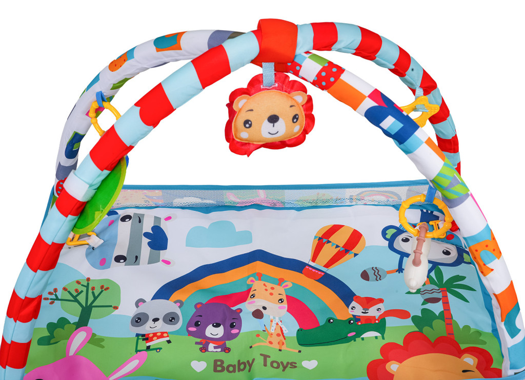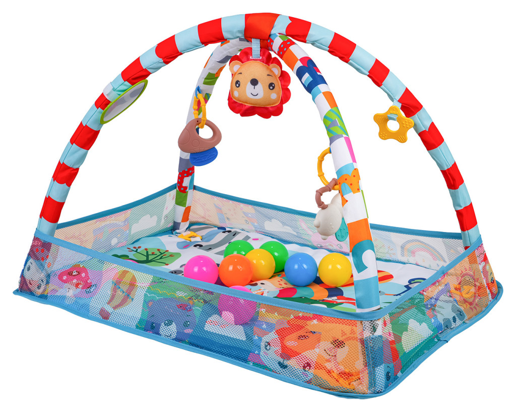 Funkcje: - zestaw odpowiedni dla maluszków od pierwszych dni życia, - wykonany z bezpiecznych materiałów, - żywe kolory przyciągają wzrok dziecka, - może pełnić rolę leżanki, kojca, suchego basenu, - solidna konstrukcja, - odczepiane zawieszki (bezpieczne lusterko, grzybek z grzechotką i gryzakiem, pszczółka z gryzakiem i grzechotką, gryzak, lew z piszczałką), - zestaw zapakowany w opakowanie w kształcie torebki z paskiem. |