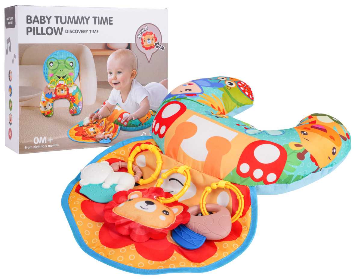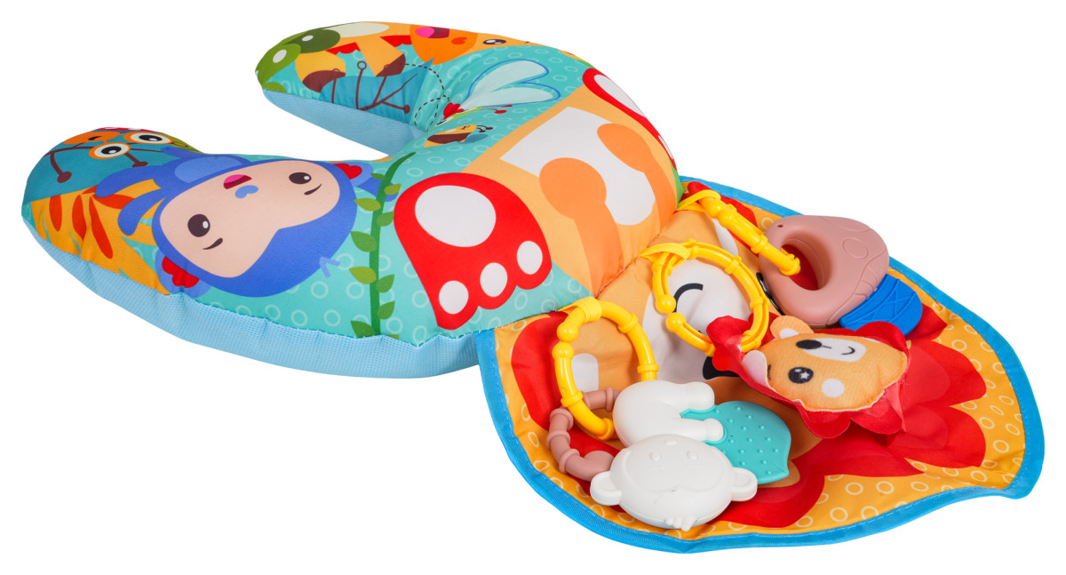 Funkcje: - odpowiednia dla maluszków od pierwszych dni życia, - wykonana z bezpiecznych dla maluszka materiałów, najlepszej jakości, - żywe kolory przyciągają wzrok dziecka, ciekawią i zachęcają do zabawy, - może pełnić funkcję poduszki, zabezpieczenia czy rogala do samochodu, - posiada odczepiane elementy, - zawieszka z misiem i grzybkiem posiada gryzak i grzechotkę, - zawieszka z lwem posiada piszczałkę. |