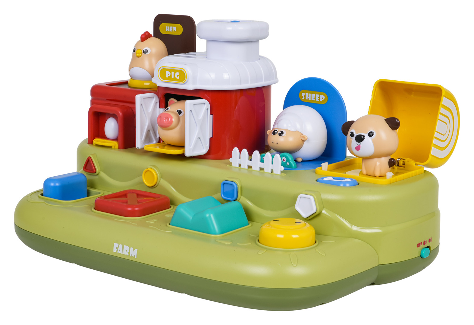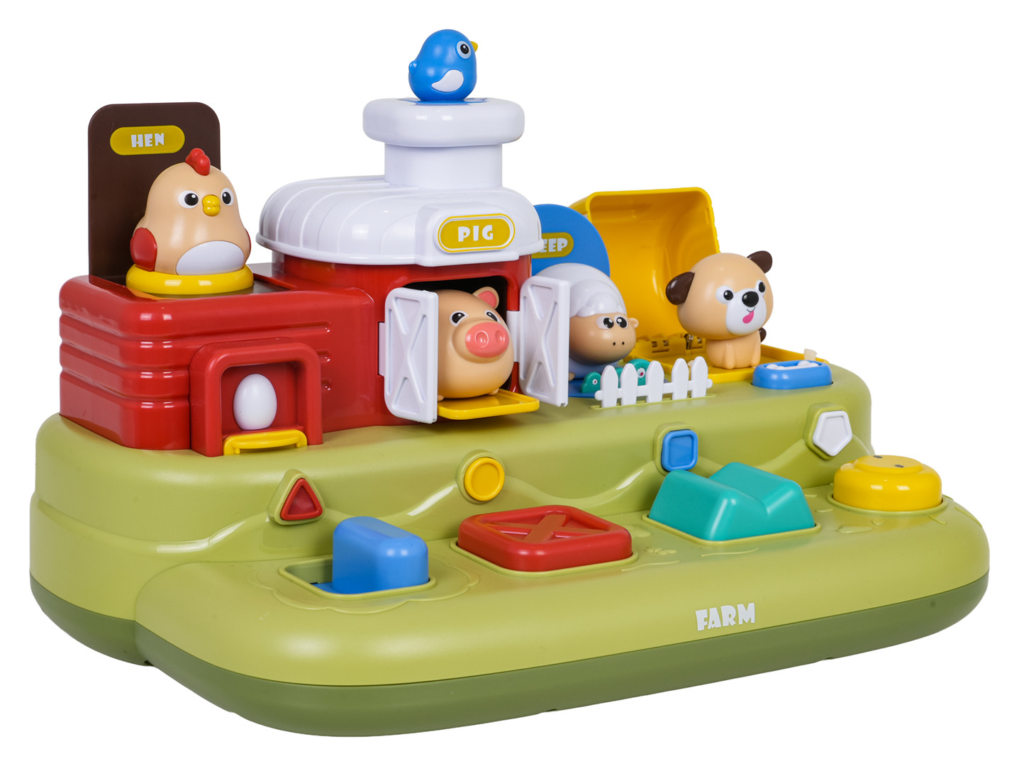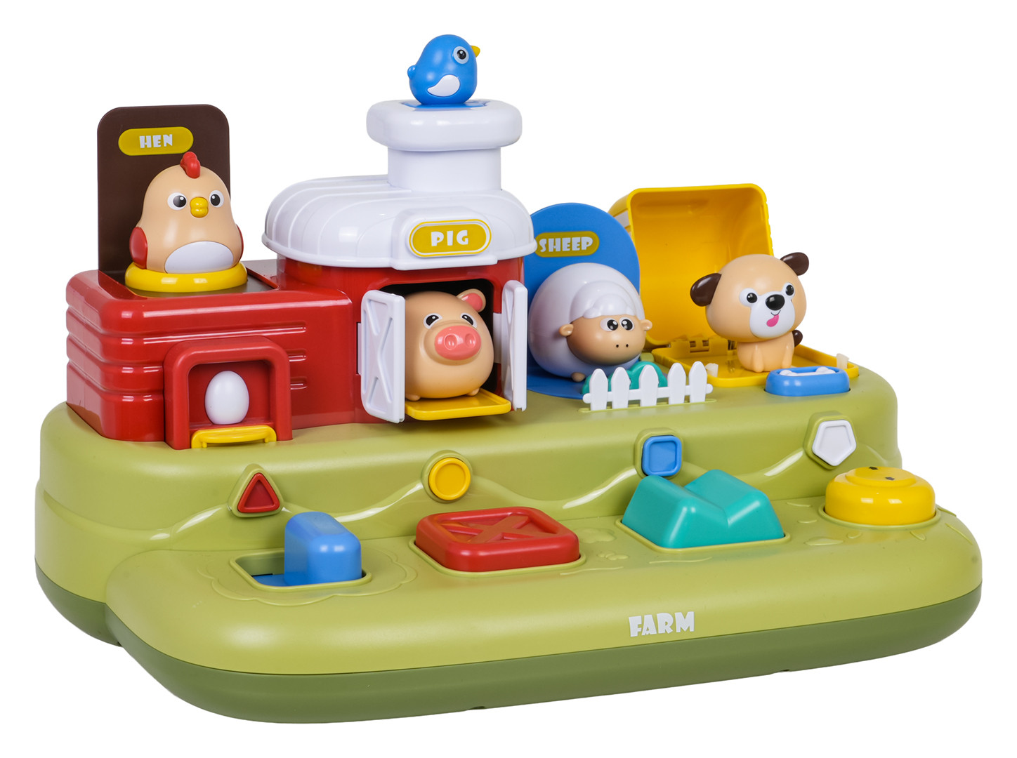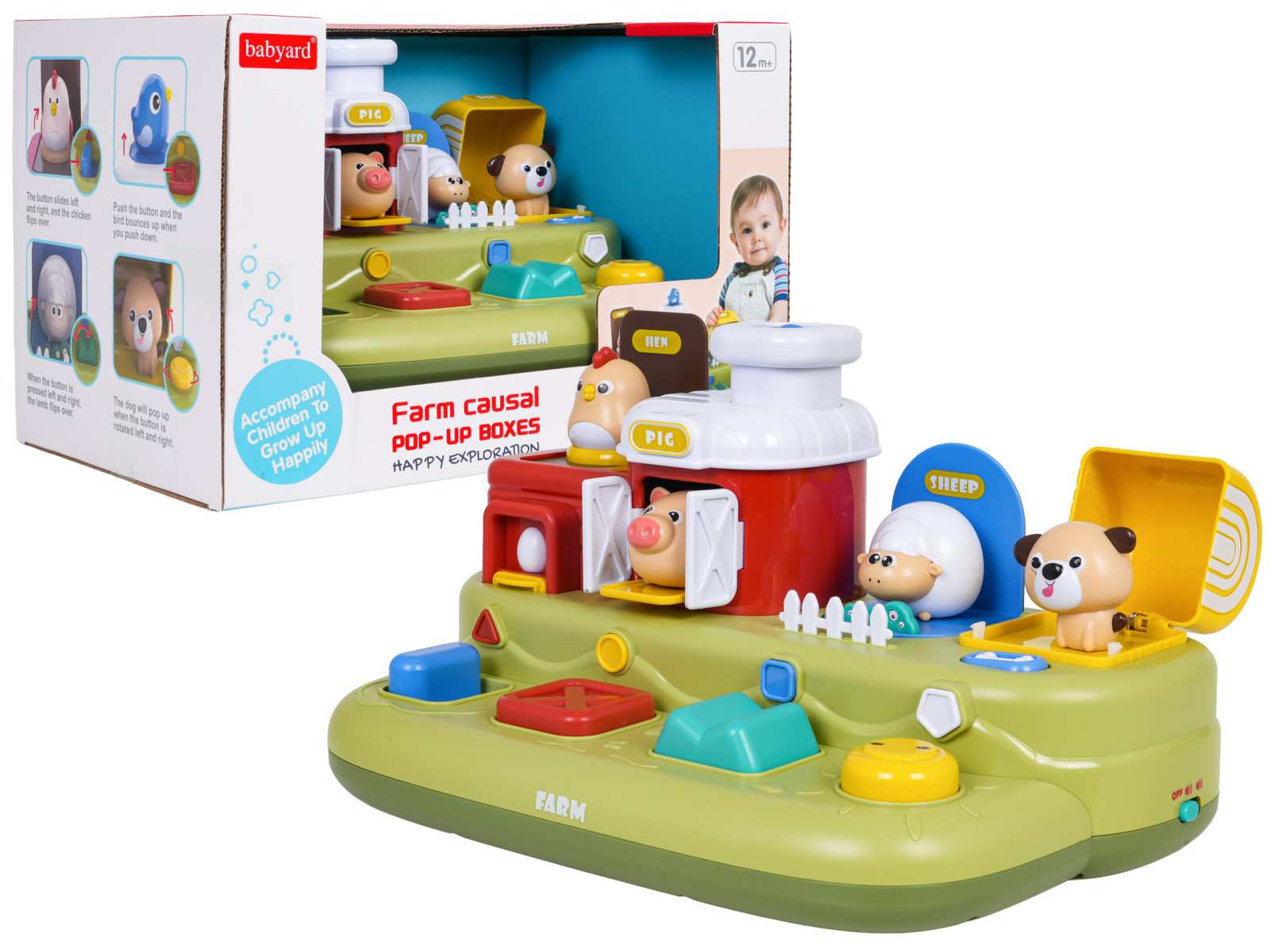Kolorowa zabawka z wyskakującymi zwierzakami oraz efektami dźwiękowymi dla dzieci od dwunastego miesiąca życia. Zabawka wykonana została z najlepszej jakości bezpiecznych materiałów w żywych kolorach. Na podstawce znajdują się boksy i przyciski w różnych kształtach. Po przesunięciu w prawo niebieskiego przycisku wyskakuje kurczak, po naciśnięciu czerwonego przycisku otwierają się drzwi i wyskakuje świnka. Kolejno po naciśnięciu zielonego pojawia się owieczka, a po przekręceniu żółtego zobaczymy pieska. Nad przyciskami znajdują się również guziczki, które uruchamiają różne dźwięki, melodie i odgłosy: odgłosy zwierzątek, melodie. Zabawka zasilana jest bateriami typu 3 x AA 1,5 V (baterii brak w zestawie).