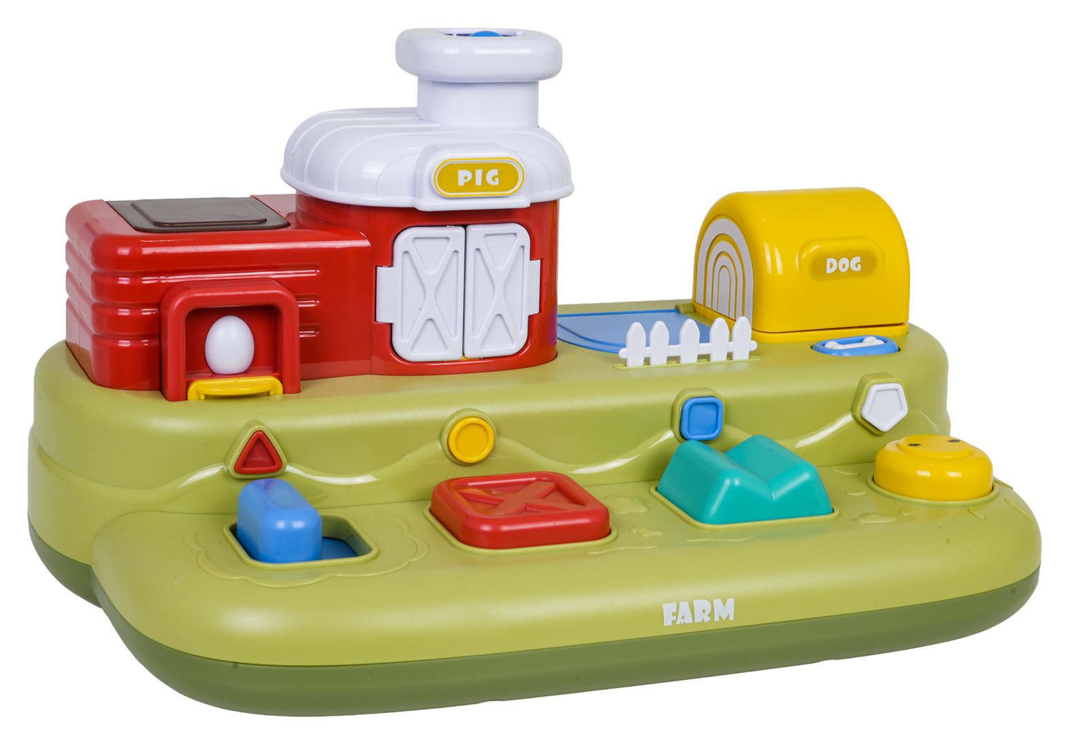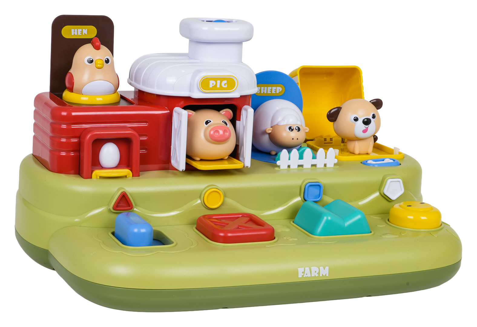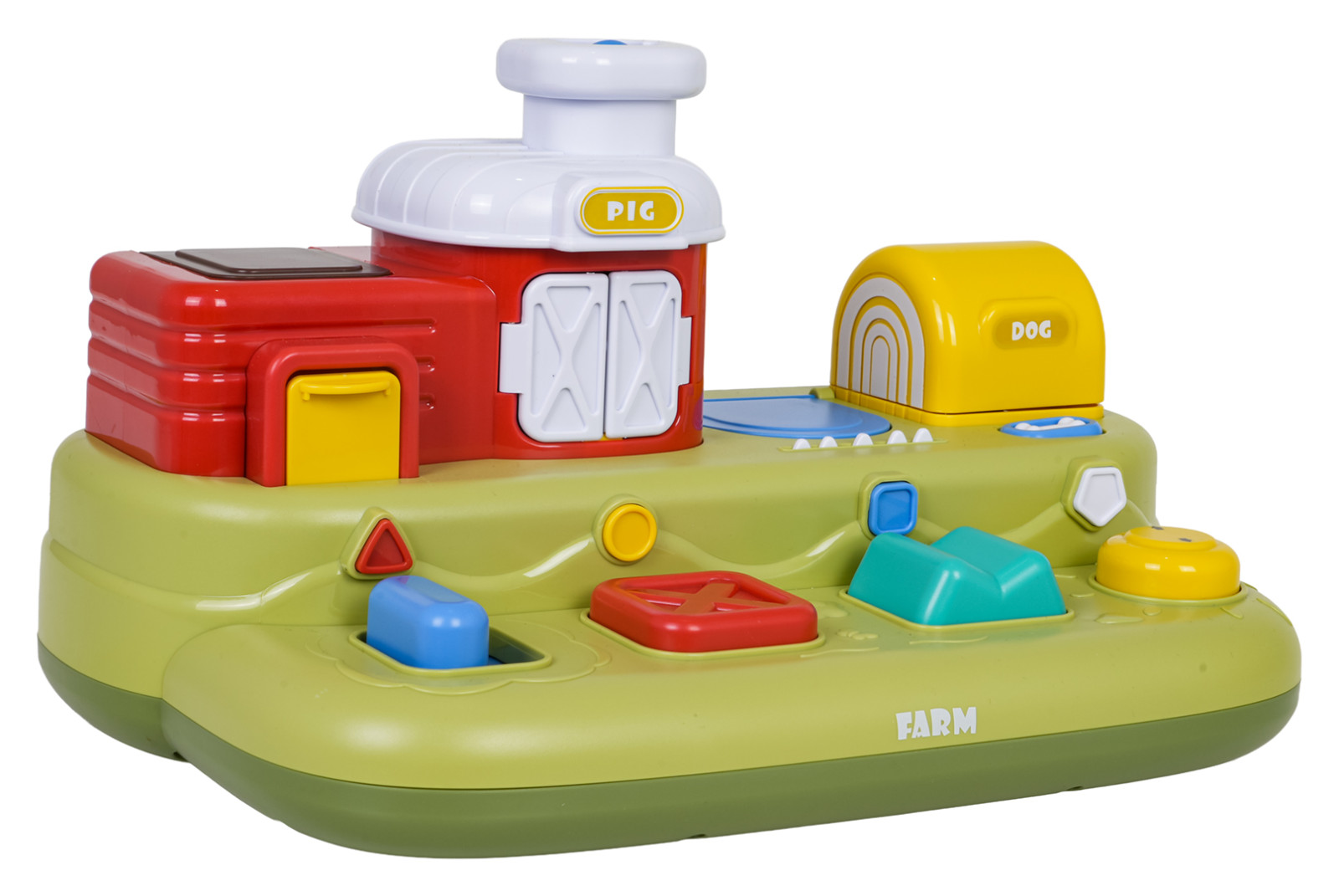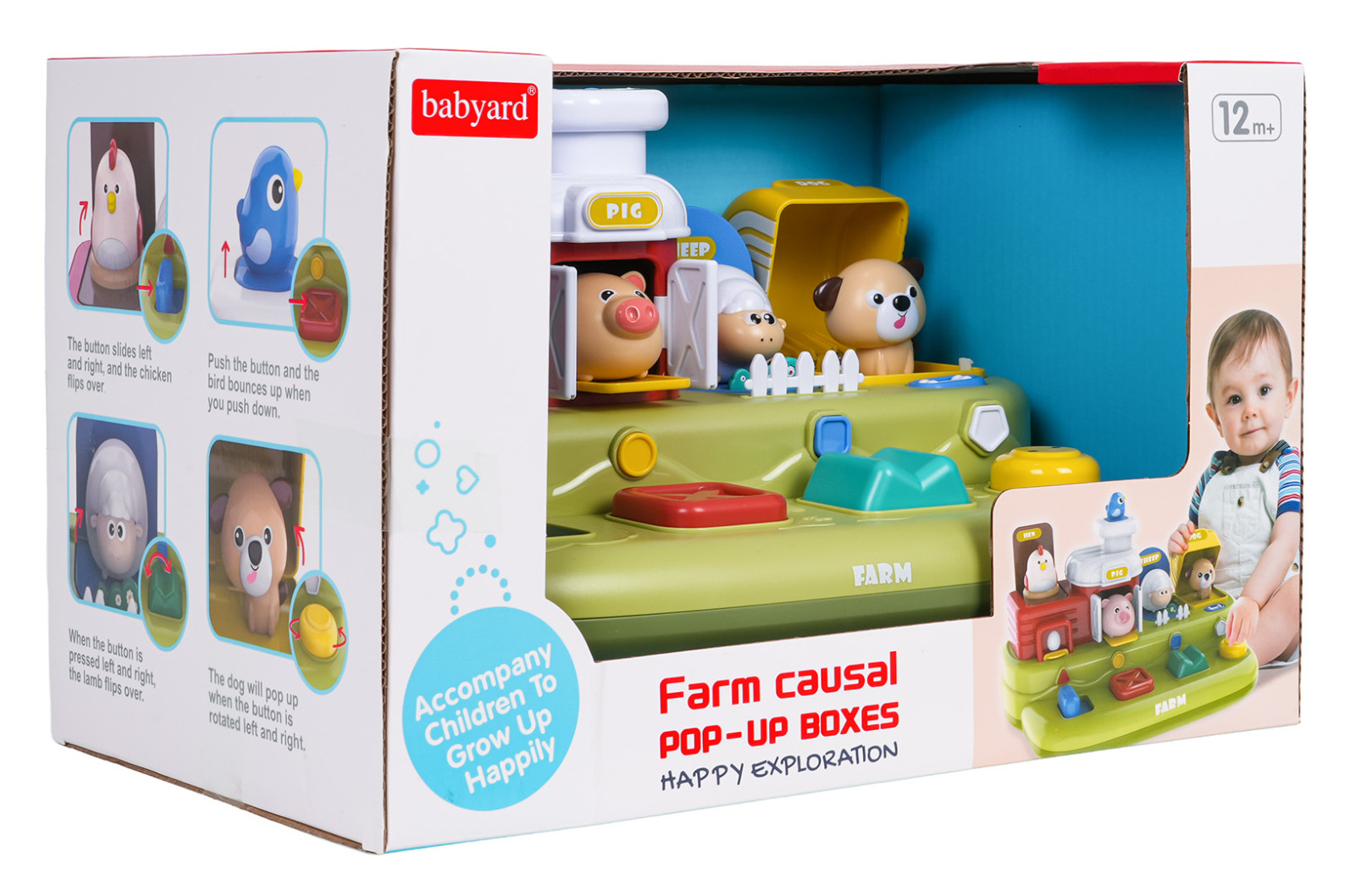 Kolorowa zabawka z wyskakującymi zwierzakami oraz efektami dźwiękowymi dla dzieci od dwunastego miesiąca życia. Zabawka wykonana została z najlepszej jakości bezpiecznych materiałów w żywych kolorach. Na podstawce znajdują się boksy i przyciski w różnych kształtach. Po przesunięciu w prawo niebieskiego przycisku wyskakuje kurczak, po naciśnięciu czerwonego przycisku otwierają się drzwi i wyskakuje świnka. Kolejno po naciśnięciu zielonego pojawia się owieczka, a po przekręceniu żółtego zobaczymy pieska. Nad przyciskami znajdują się również guziczki, które uruchamiają różne dźwięki, melodie i odgłosy: odgłosy zwierzątek, melodie. Zabawka zasilana jest bateriami typu 3 x AA 1,5 V (baterii brak w zestawie).