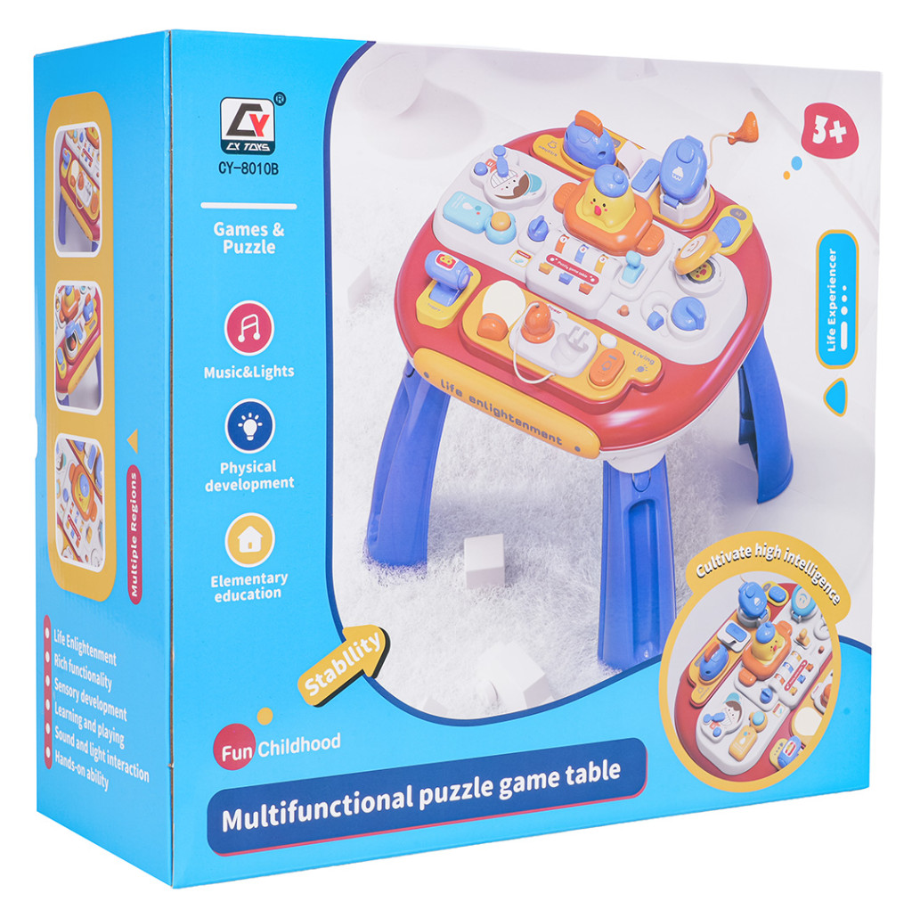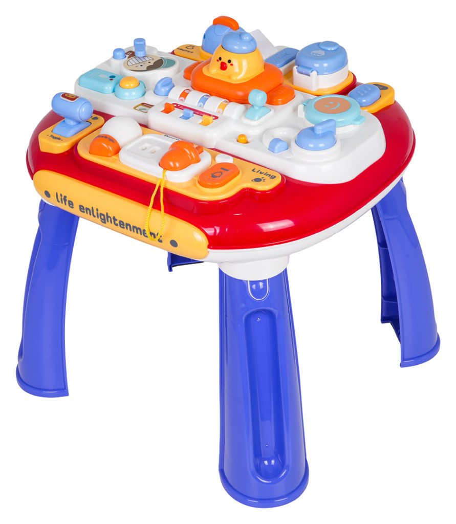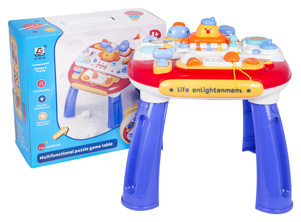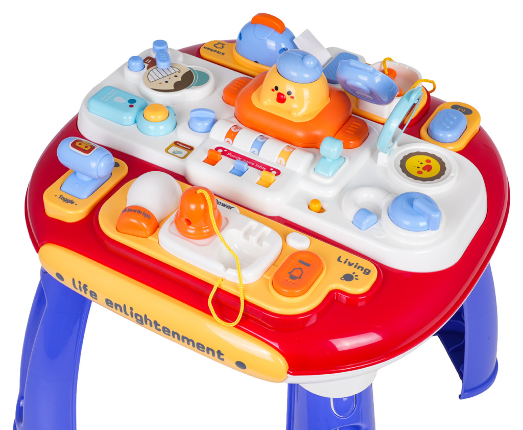 Wielofunkcyjny interaktywny stolik z efektem dźwięku i światła dla dzieci od trzeciego roku życia. Zestaw wykonano z najlepszej jakości tworzywa sztucznego w żywych kolorach. Zestaw nie posiada ostrych zakończeń i jest w pełni bezpieczny dla dzieci. Nóżki stoliczka można odpiąć i zabrać blat wszędzie ze sobą. Dodatkowo nóżki stoliczka posiadają antypoślizgowe podstawki, by zabawka nie przemieszczała się podczas zabawy. Na blacie stoliczka znajduje się wiele elementów manipulacyjnych do wciskania, przesuwania, ciągnięcia i otwierania. Efekty dźwiękowe i świetlne stymulują zmysły maluszka. Zabawka zasilana jest bateriami typu 3 x AA 1,5V (brak w zestawie).