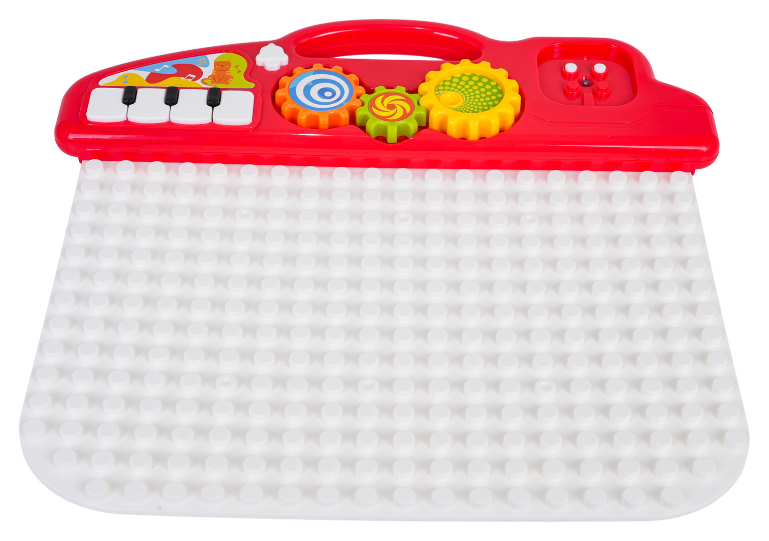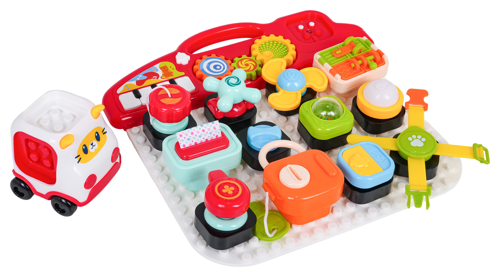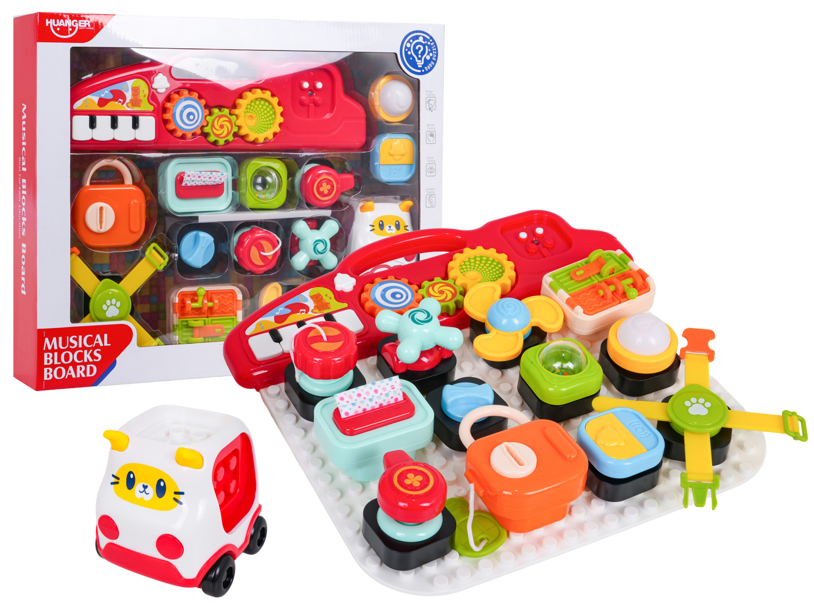 - tablica ok. 35 cm x 2 cm x 33,5 cm, - samochodzik ok. 9,5 cmx 9,1 cm x 9,5 cm, - klocuszek z kluczem i kłódką ok. 8 cm x 9,5 cm x 5 cm, - klocuszek z pompką ok. 5,5 cm x 6,5 cm x 5 cm, - klocuszek z żarówką ok. 5,5 cm x 5 cm x 5 cm, - klocuszek z dzwonkiem ok. 5,5 cm x 5,5 cm x 4,5 cm, - klocuszek ze spinerkiem ok. 8 cm x 8 cm x 5 cm, - klocuszek z zamkami ok. 8 cm x 6 cm x 5 cm, - klocuszek z gwintem ok. 6,5 cm x 5 cm x 5 cm, - klocuszek z kurkiem ok. 5,5 cm x 6 cm x 5,5 cm, - klocuszek z elementem do wyciągania ok. 7,5 cm x 7 cm x 5,5 cm, - klocuszek z pokrętłem ok. 5 cm x 5 cm x 4 cm, - klocuszek z kuleczkami do grzechotania ok. 5 cm x 5 cm x 5 cm, - klocuszek z paskami ok. 17 cm x 15,5 cm x 3 cm, - opakowanie ok. 44,8 cm x 36 cm x 10 cm. |