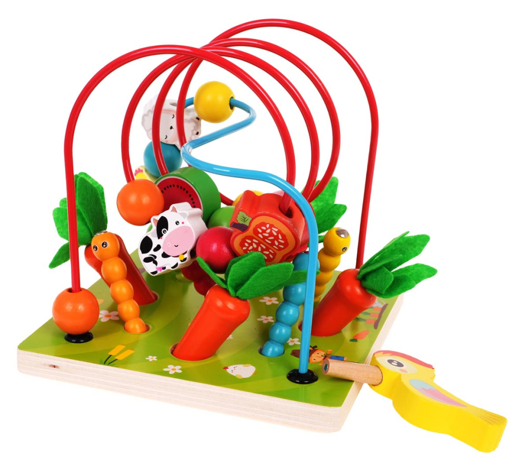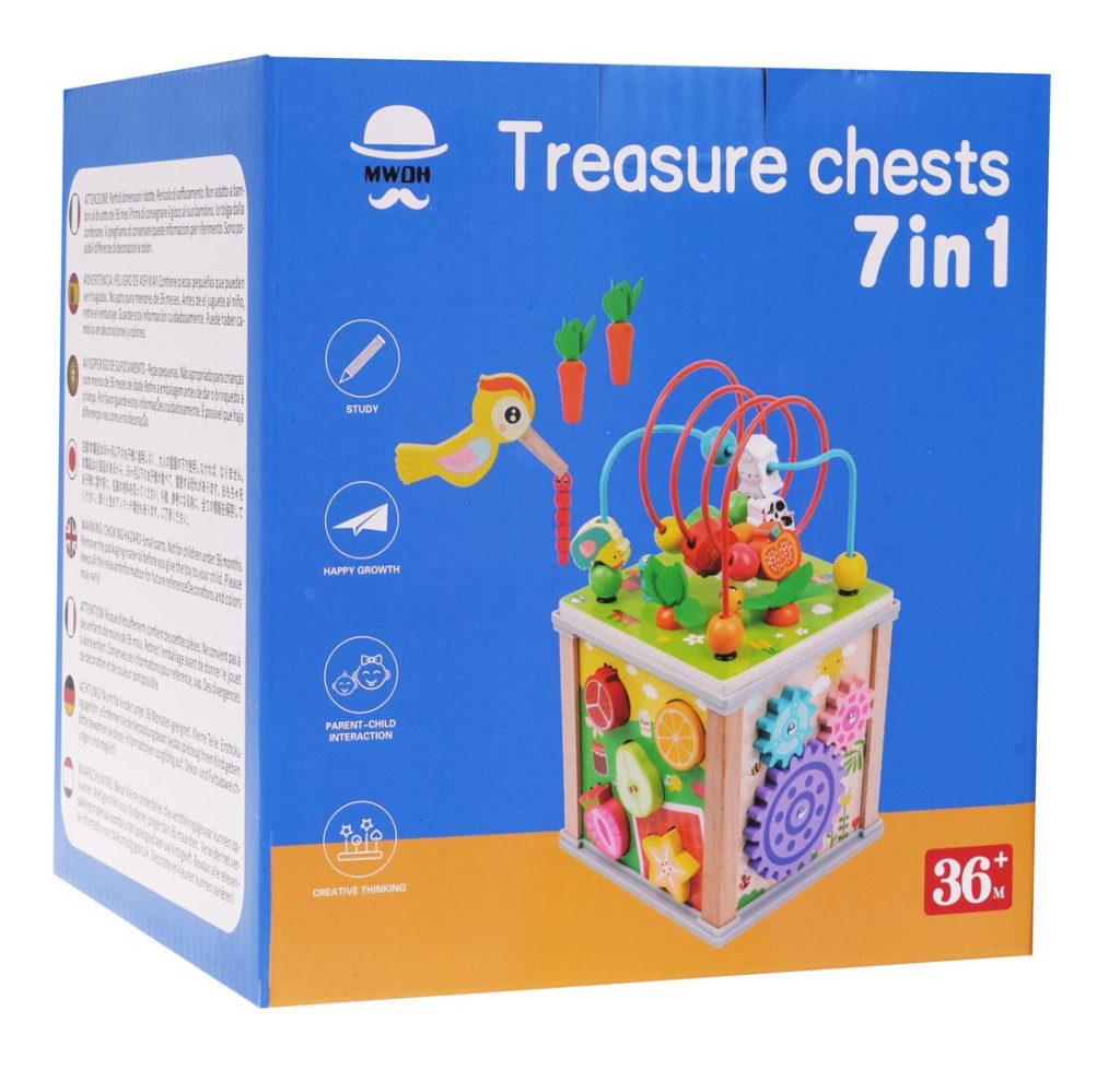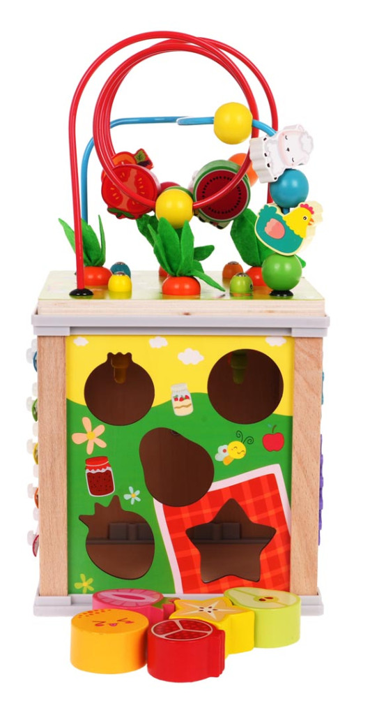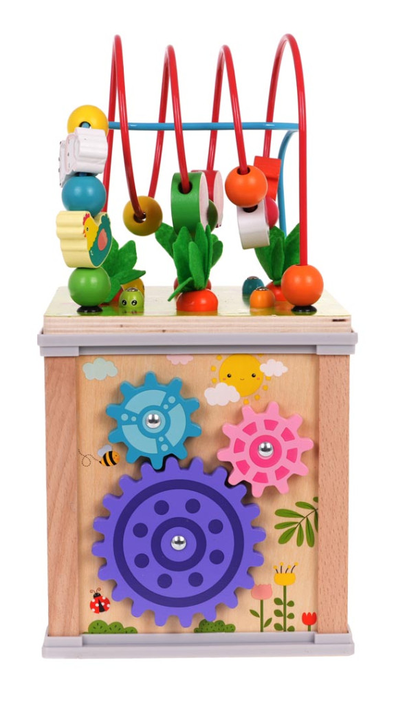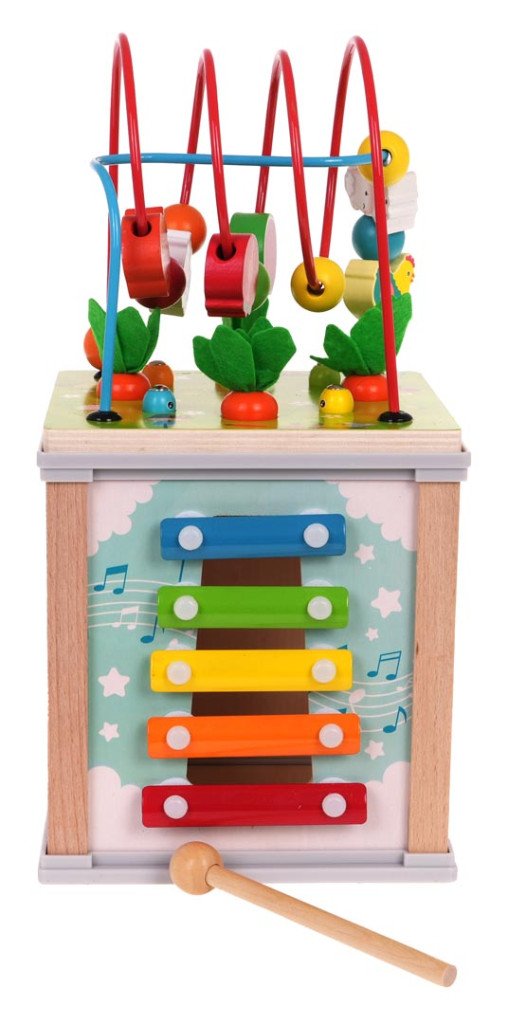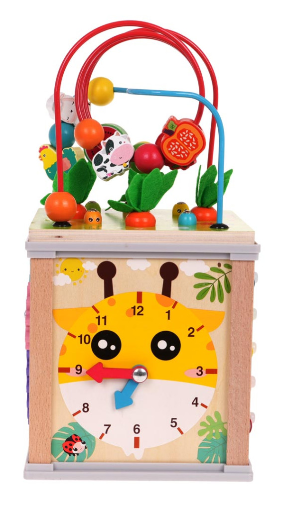 Drewniana, kolorowa bezpieczna kostka dla dzieci powyżej trzeciego roku życia. Zabawa tą kostką pobudza wyobraźnię i kreatywność. Maluszek ćwiczy zdolności manualne i koordynację wzrokowo-ruchową, uczy się rozpoznawać kolory i kształty. Drewniana kostka i jej elementy wykonane zostały z wysokiej jakości drewna, malowanego bezpieczną farbą, są trwałe i odporne na uszkodzenia, zabawka posłuży latami. Kostka składa się z sześciu pobocznych ścian. Na pięciu ścianach kostki znajdują się różne atrakcje. Ścianka z zegarem Na tej ściance znajduje się zegar z ruchomymi wskazówkami. Ścianka z cymbałkami Na tej ściance znajdują się cymbałki, w zestawie mamy też pałeczkę drewnianą. Ścianka z sorterem kształtów Na ściance znajdują się otwory w różnych kształtach, do których dziecko musi dopasować odpowiednie klocuszki (klocuszki w zestawie). Ścianka z kołami zębatymi Na ściance znajdują się trzy kółeczka zębate, poruszając jednym, wprawiamy w ruch wszystkie. Ścianka z grą marchewka i przekładanką Na tej ściance znajdują się otwory na włożenie drewnianych marchewek oraz robaczków. Robaczki posiadają magnesy, należy je usunąć za pomocą ptaszka, który na dzióbku również ma magnes. Nad planszą z otworami dla robaczków i marchewek mamy przekładankę z koralikami. |